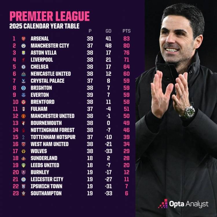 ตารางคะแนนพรีเมียร์ลีก 2025: อาร์เซนอลนำเป็นจ่าฝูง, ซิตี้อยู่อันดับสอง, ยูไนเต็ดอยู่นอกท็อปเท็น ลูกได้เสีย: ลิเวอร์พูล, เชลซี