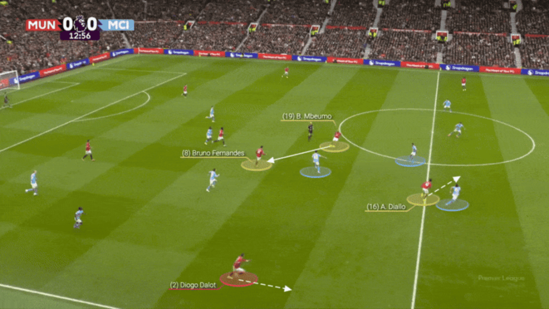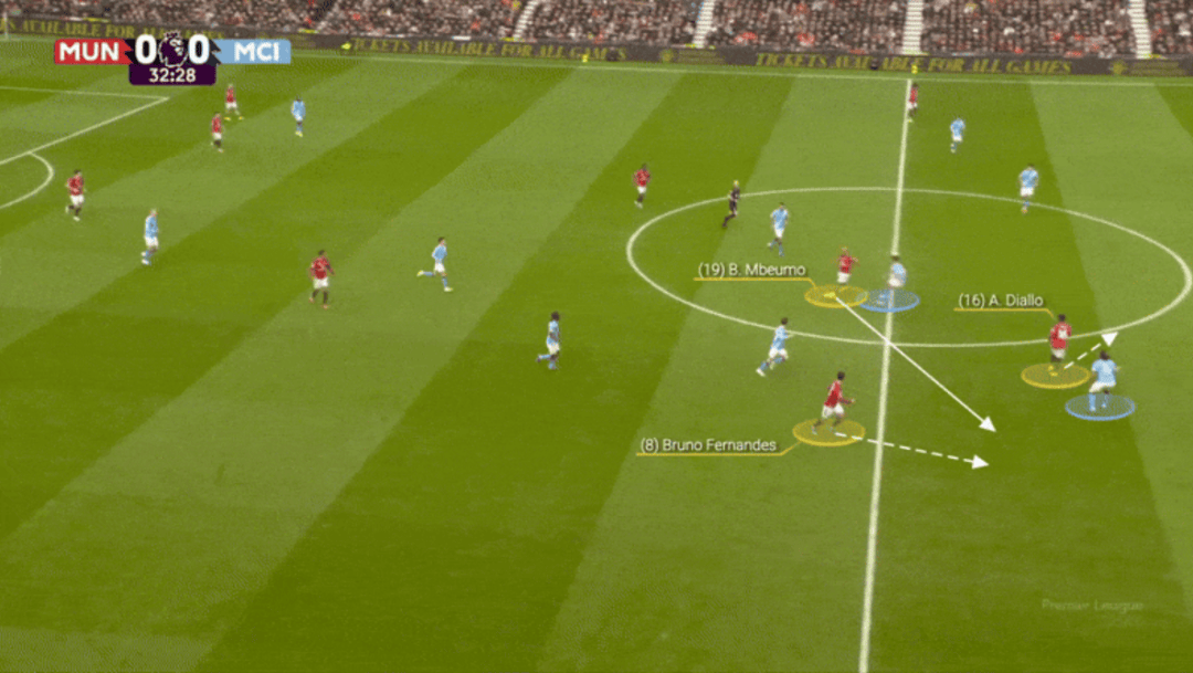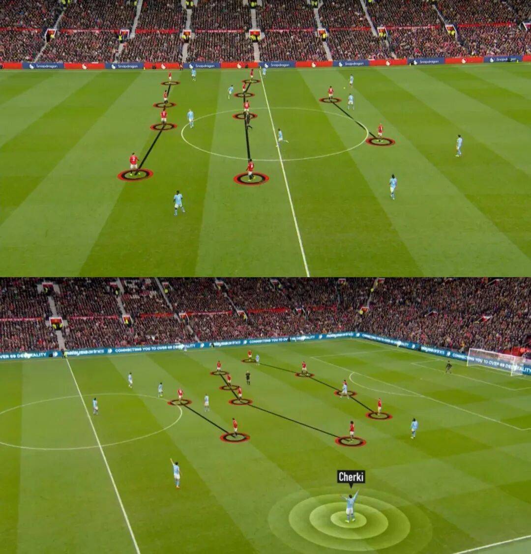 ในเกมรุก คาร์ริคและทีมโค้ชใช้แผนการเล่นที่ไม่มีกองหน้าตัวเป้าแบบดั้งเดิม ผ่านการสลับตำแหน่งและการเคลื่อนที่อย่างต่อเนื่อง พวกเขาใช้ประโยชน์จากพื้นที่ว่างหลังแนวกลางและแนวรับของแมนเชสเตอร์ ซิตี้ เอ็มบูโม่ซึ่งรับบทเป็นกองหน้าตัวเป้า ถอยลึกลงมา ขณะที่บรูโน่ แฟร์นันด์ส, อามาด ดิยัลโล่, แพทริค ดูเกต์ และแม้แต่แบ็คอย่างดิโอโก้ ดาโลต์ ต่างก็วิ่งทำทางอย่างเป็นระบบเพื่อสร้างโอกาสทำประตู