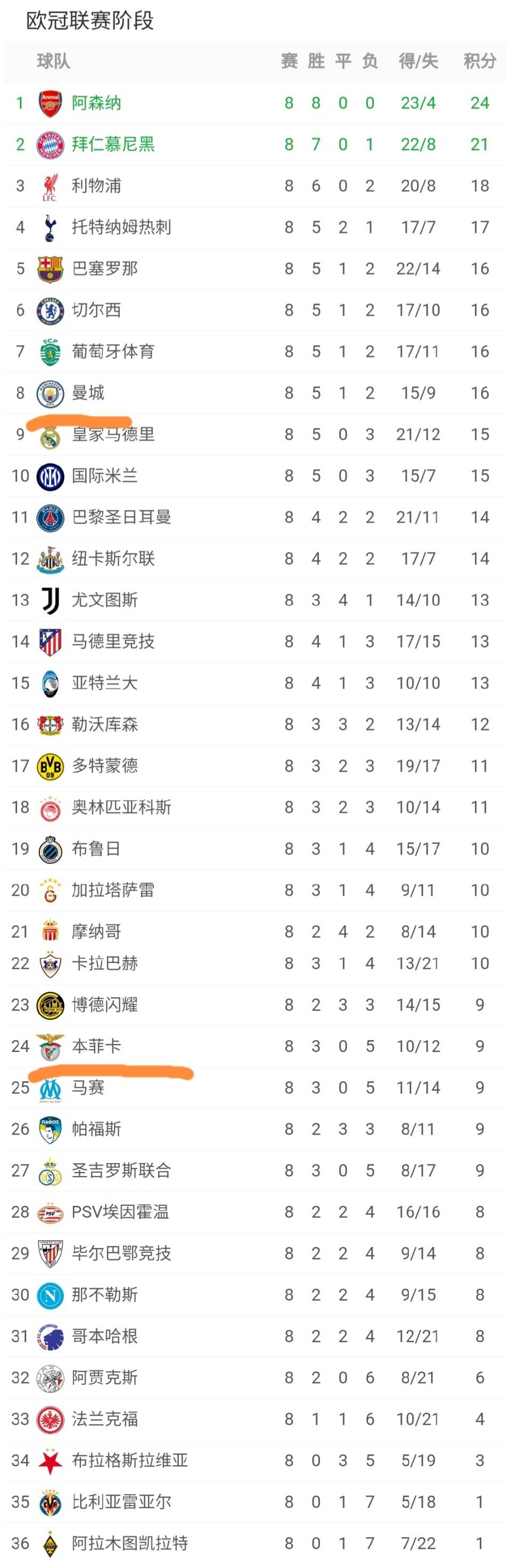 ในรอบสุดท้ายของการแข่งขันที่สิ้นสุดลงเมื่อเช้านี้ อาตาลันต้าพ่ายแพ้ 0-1 ในเกมเยือนต่อแซงต์-กิลโลайส์ บาเยิร์น มิวนิก ชนะ 2-1 ในเกมเยือนต่อพีเอสวี ไอนด์โฮเฟ่น นิวคาสเซิล ยูไนเต็ด เสมอ 1-1 ในเกมเยือนต่อแชมป์เก่าปารีส แซงต์-แชร์กแมง และสลาเวีย ปราก พ่ายแพ้ 1-4 ในเกมเยือนต่อปาฟอส เอฟซีเชลซีเอาชนะนาโปลี 3-2 ในเกมเยือน ยูเวนตุสเสมอโมนาโก 0-0 ในเกมเยือน กาลาตาซารายแพ้แมนเชสเตอร์ ซิตี้ 2-0 ในเกมเยือน คาราบัคพ่ายแพ้ลิเวอร์พูล 6-0 ในเกมเยือน และท็อตแน่ม ฮ็อตสเปอร์เอาชนะไอน์ทรัค แฟรงค์เฟิร์ต 2-0 ในเกมเยือนอินเตอร์ มิลาน เอาชนะ โบรุสเซีย ดอร์ทมุนด์ 2-0 ในเกมเยือน, มาร์กเซย แพ้ 0-3 ในเกมเยือน คลับ บรูจจ์, เรอัล มาดริด พ่ายแพ้อย่างน่าตกใจ 2-4 ในเกมเยือน เบนฟิก้า, บียาร์เรอัล แพ้ 0-3 ในเกมเยือน ไบเออร์ เลเวอร์คูเซ่น, โคเปนเฮเกน แพ้ 1-4 ในเกมเยือน บาร์เซโลนา, และ โบโด/กลิมท์ ชนะ 2-1 ในเกมเยือน แอตเลติโก มาดริดสปอร์ติ้งซีพี ชนะ 3-2 ในเกมเยือนแอธเลติกบิลเบา, ไคราต์ อัลมาตี แพ้ 2-3 ให้กับอาร์เซนอลในเกมเยือน, ขณะที่โอลิมเปียกอส คว้าชัยชนะ 2-1 ในเกมเยือนอาแจ็กซ์