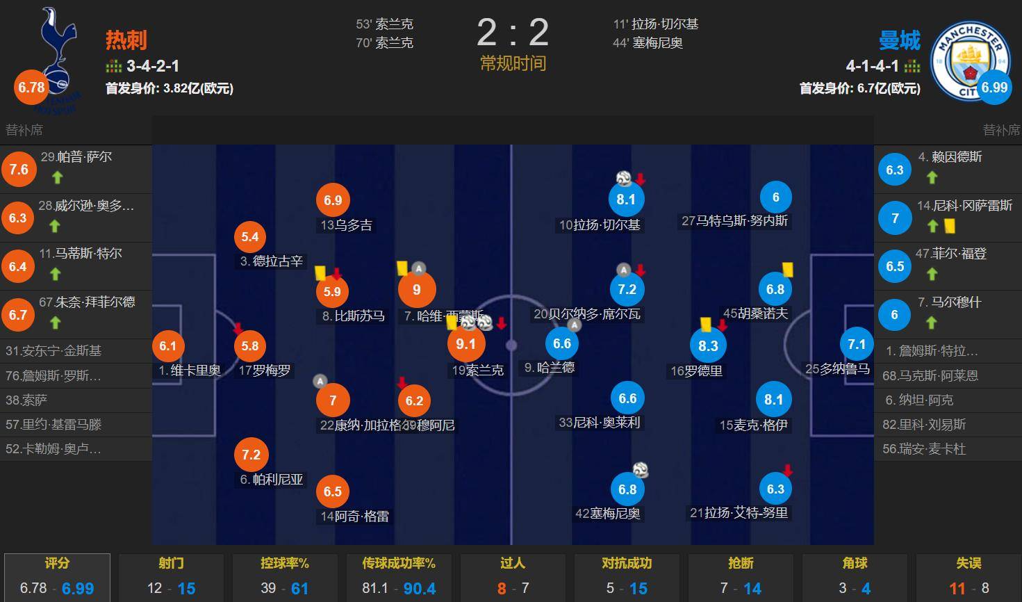 ในการแข่งขันนี้ ไม่มีผู้เล่นในแนวรับและกองกลางตัวรับของท็อตแน่ม ฮ็อตสเปอร์สได้รับคะแนนต่ำกว่ามาตรฐานน้อยกว่าสามคน ซึ่งสะท้อนให้เห็นถึงแนวรับที่อ่อนแอของทีมนักเตะใหม่สองคนของแมนเชสเตอร์ ซิตี้ในฤดูกาลนี้ เชอร์กี้และเซมิโอเน่ ทำประตูได้สองลูก แต่การยืนกรานของกวาร์ดิโอลาในการส่งผู้เล่นบางคนลงสนามกลับส่งผลเสีย เมื่อขาดเดอ บรอยน์, กุนโดกัน และคนอื่นๆ รวมถึงโรดรีที่เล่นอย่างรุนแรงเกินไปหลังจากอาการบาดเจ็บหนัก โดยเฉพาะการแสดงการป้องกันที่แข็งเกินไป ทำให้กองกลางของซิตี้ในปัจจุบันขาดบุคลากรที่จะเล่นฟุตบอลที่เน้นการครองบอลอย่างแท้จริงการยืนกรานของกวาร์ดิโอลาในสไตล์นี้เท่ากับเป็นการสร้างฟุตบอลแบบครอบครองบอลเทียม – ซึ่งเป็นการส่งบอลไปมาด้านข้างและถอยหลังเป็นหลัก แม้ว่าจะทำให้สถิติการครองบอลดูสูงขึ้น แต่กลับสร้างโอกาสผ่านบอลที่เฉียบคมหรือการส่งบอลที่คุกคามได้น้อยมาก การใช้วิธีที่ตรงไปตรงมามากกว่าน่าจะเหมาะสมกับจังหวะการโจมตีที่รวดเร็วและคุณสมบัติที่คล่องตัวและกระชับของซิตี้มากกว่า