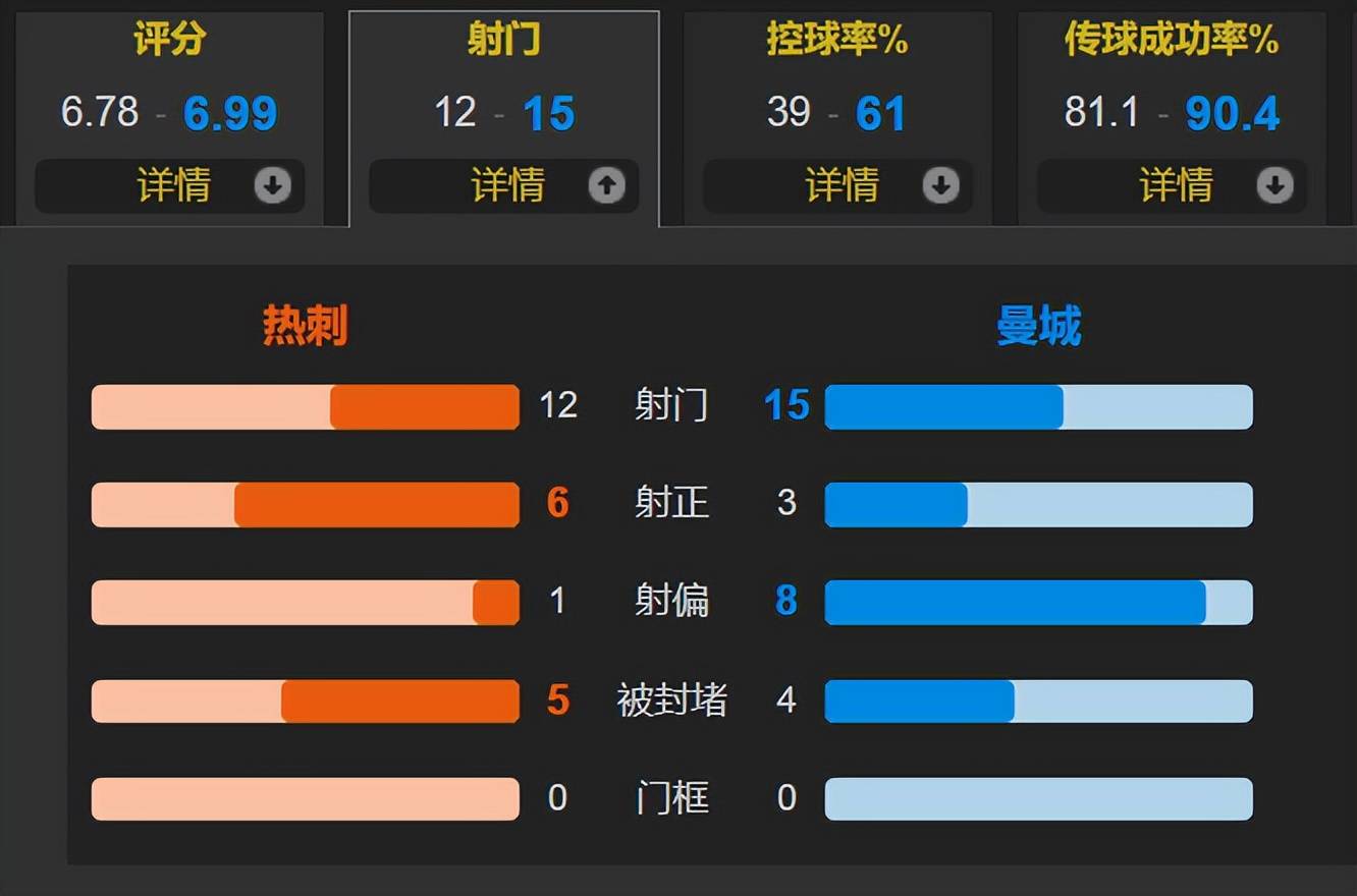 ตลอดการแข่งขัน แมนเชสเตอร์ ซิตี้ครองบอลได้ 61% โดยยิงทั้งหมด 15 ครั้ง และมี 3 ครั้งที่เข้ากรอบ ขณะที่ ท็อตแน่ม ฮ็อทสเปอร์ ยิงได้ 12 ครั้ง โดย 6 ครั้งเข้ากรอบ ซึ่งเท่ากับสองเท่าของจำนวนการยิงเข้ากรอบของซิตี้
