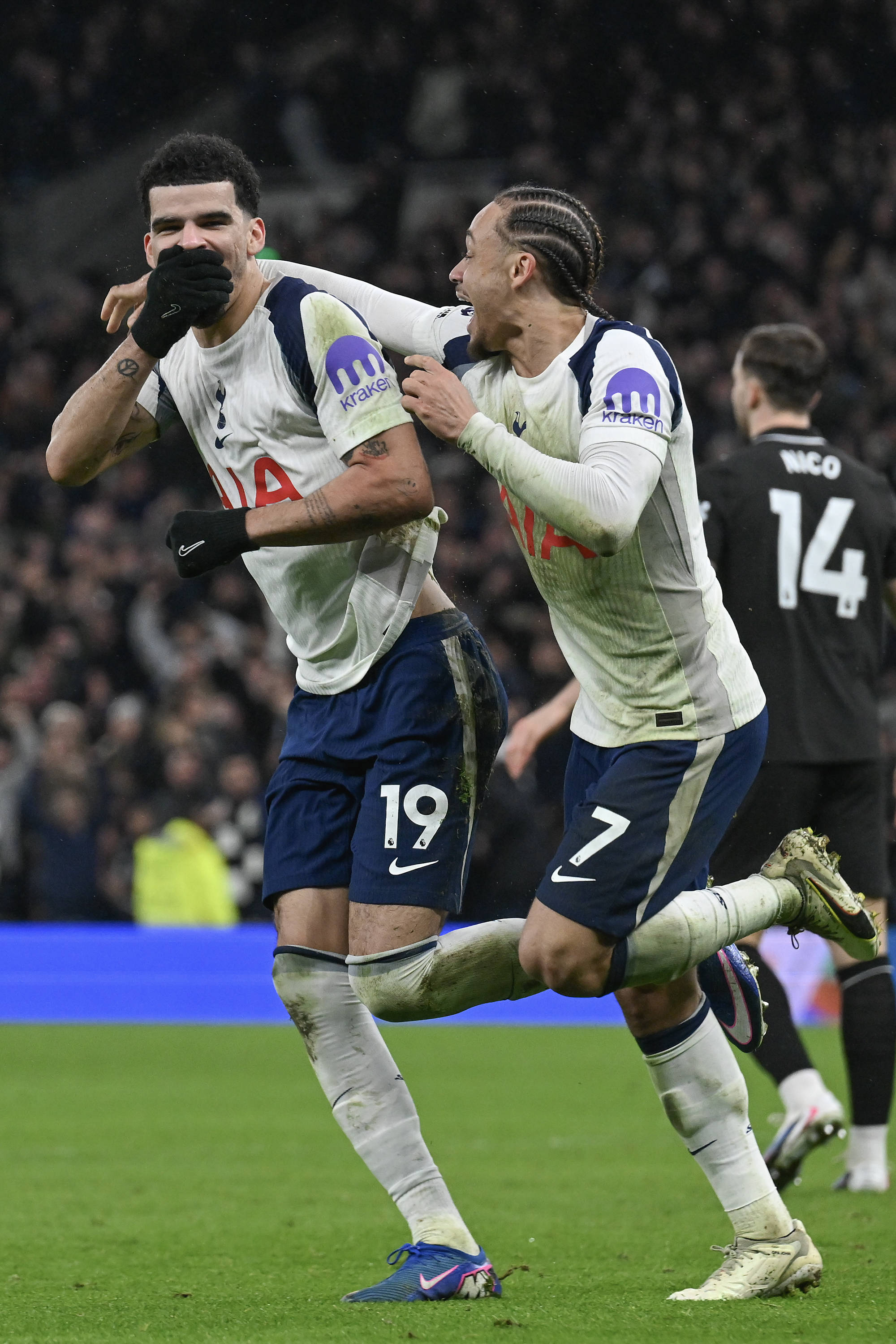 เมื่อวันที่ 1 กุมภาพันธ์, นักเตะท็อตแนม ฮ็อตสเปอร์ ทามมี อับราฮัม (ซ้าย) ฉลองกับเพื่อนร่วมทีมแฮร์รี วินค์ส หลังจากทำประตูได้. สำนักข่าวซินหัว