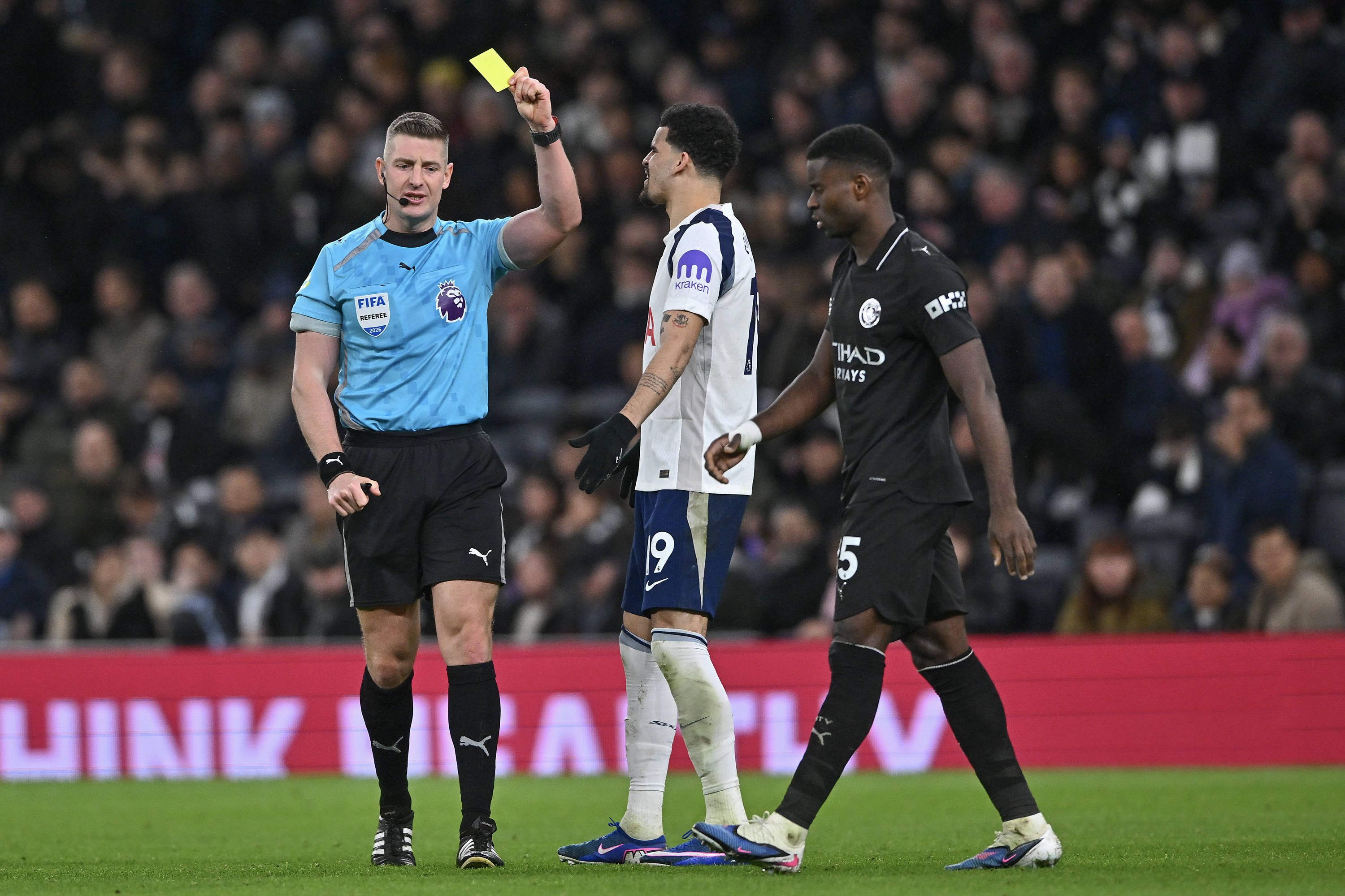 เมื่อวันที่ 1 กุมภาพันธ์ ท็อตแนม ฮ็อตสเปอร์ ผู้เล่น ทามมี อับราฮัม (กลาง) ถูกใบเหลือง. สำนักข่าวซินหัว