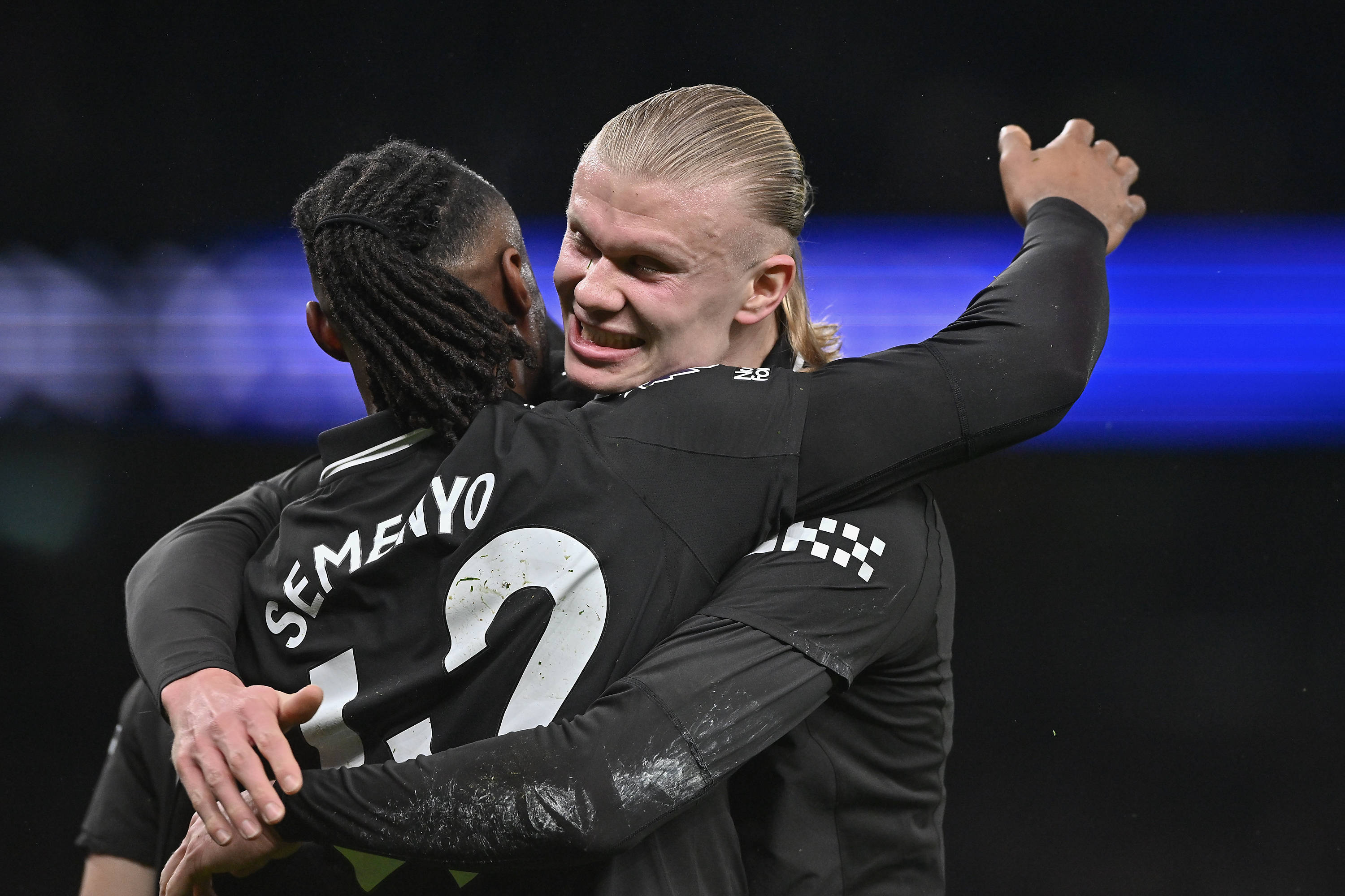 เมื่อวันที่ 1 กุมภาพันธ์, นักเตะแมนเชสเตอร์ ซิตี เซเมโด ฉลองกับเพื่อนร่วมทีม ฮาแลนด์ (ขวา) หลังจากทำประตูได้. สำนักข่าวซินหัว