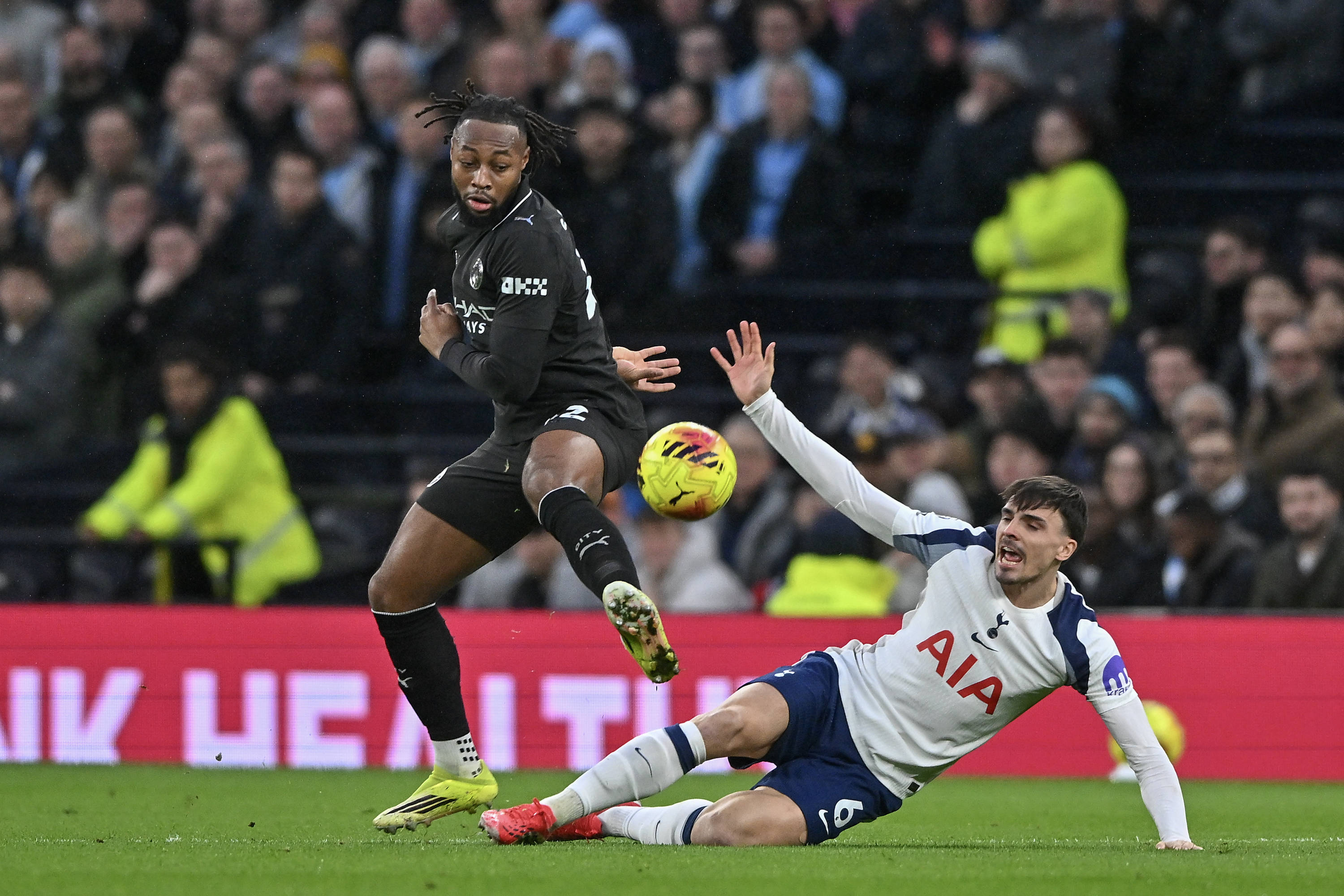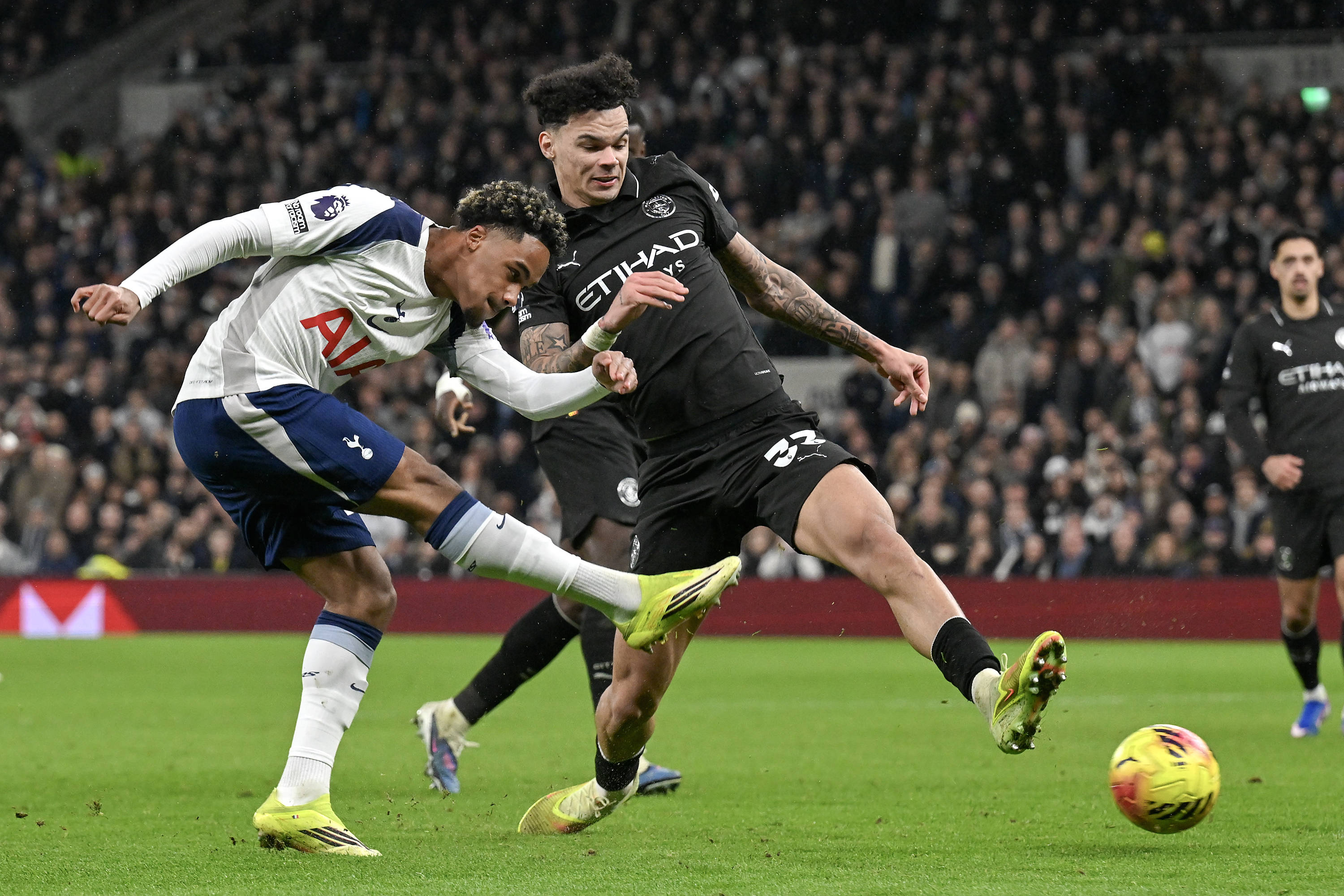 เมื่อวันที่ 1 กุมภาพันธ์ เบน อูโดกี้ ของท็อตแน่ม ฮ็อตสเปอร์ (ซ้าย) เข้าปะทะกับ รูเบน นูเนส ของแมนเชสเตอร์ ซิตี้ เพื่อแย่งบอล สำนักข่าวซินหัว