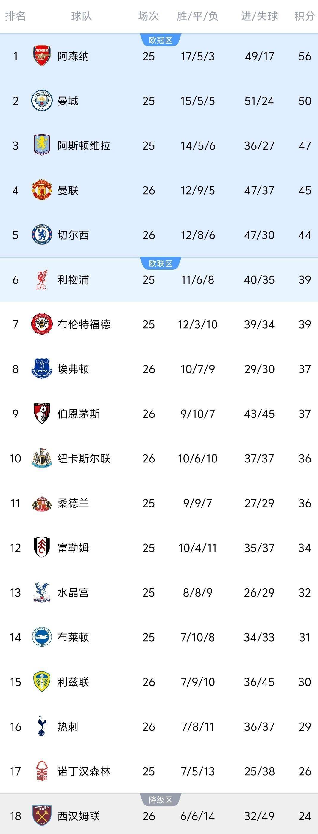 เมื่อจบการแข่งขันในรอบนี้ ตารางคะแนนพรีเมียร์ลีกได้เปลี่ยนแปลงไปอีกครั้ง อาร์เซนอลยังคงรักษาตำแหน่งจ่าฝูงไว้ด้วย 56 คะแนน ตามมาอย่างใกล้ชิดโดยแมนเชสเตอร์ ซิตี้ที่มี 50 คะแนน ขณะที่การแข่งขันสองทีมเพื่อชิงแชมป์เริ่มชัดเจนขึ้นเรื่อยๆ แอสตัน วิลล่าอยู่ในอันดับสามด้วย 47 คะแนน ยังคงมีโอกาสลุ้นจบในสี่อันดับแรกแมนเชสเตอร์ ยูไนเต็ด ครองอันดับสี่ด้วย 45 คะแนน ขณะที่เชลซีอยู่อันดับห้าด้วย 44 คะแนน – ช่องว่างเพียงหนึ่งคะแนนระหว่างทั้งสองทีมบ่งบอกถึงการต่อสู้ที่เข้มข้นเพื่อคว้าตั๋วแชมเปียนส์ลีก ลิเวอร์พูลยังคงอยู่อันดับหกด้วย 39 คะแนน ยังคงมีความหวังที่จะจบในสี่อันดับแรก ท็อตแน่ม ฮ็อตสเปอร์พ่ายแพ้ทำให้พวกเขามี 29 คะแนน ตกลงมาอยู่อันดับที่ 16 และห่างจากโซนตกชั้นเพียงห้าคะแนนเท่านั้น ต้องเผชิญกับแรงกดดันมหาศาลเพื่อหลีกเลี่ยงการตกชั้นเวสต์แฮม ยูไนเต็ด เสมอกับแมนเชสเตอร์ ยูไนเต็ด ในช่วงทดเวลาบาดเจ็บ อยู่ในอันดับที่ 18 มี 24 คะแนน อยู่ในโซนตกชั้นอย่างเหนียวแน่น วูล์ฟแฮมป์ตัน วันเดอเรอร์ส อยู่ในอันดับสุดท้าย มีเพียง 8 คะแนน การตกชั้นแทบจะแน่นอนแล้ว เบิร์นลีย์ อยู่ในอันดับที่ 19 มี 15 คะแนน ความหวังในการรอดตกชั้นดูจะริบหรี่ลงเรื่อยๆ น็อตติงแฮม ฟอเรสต์ อยู่ในอันดับที่ 17 มี 26 คะแนน ยังคงต่อสู้เพื่อหนีตกชั้นต่อไป
