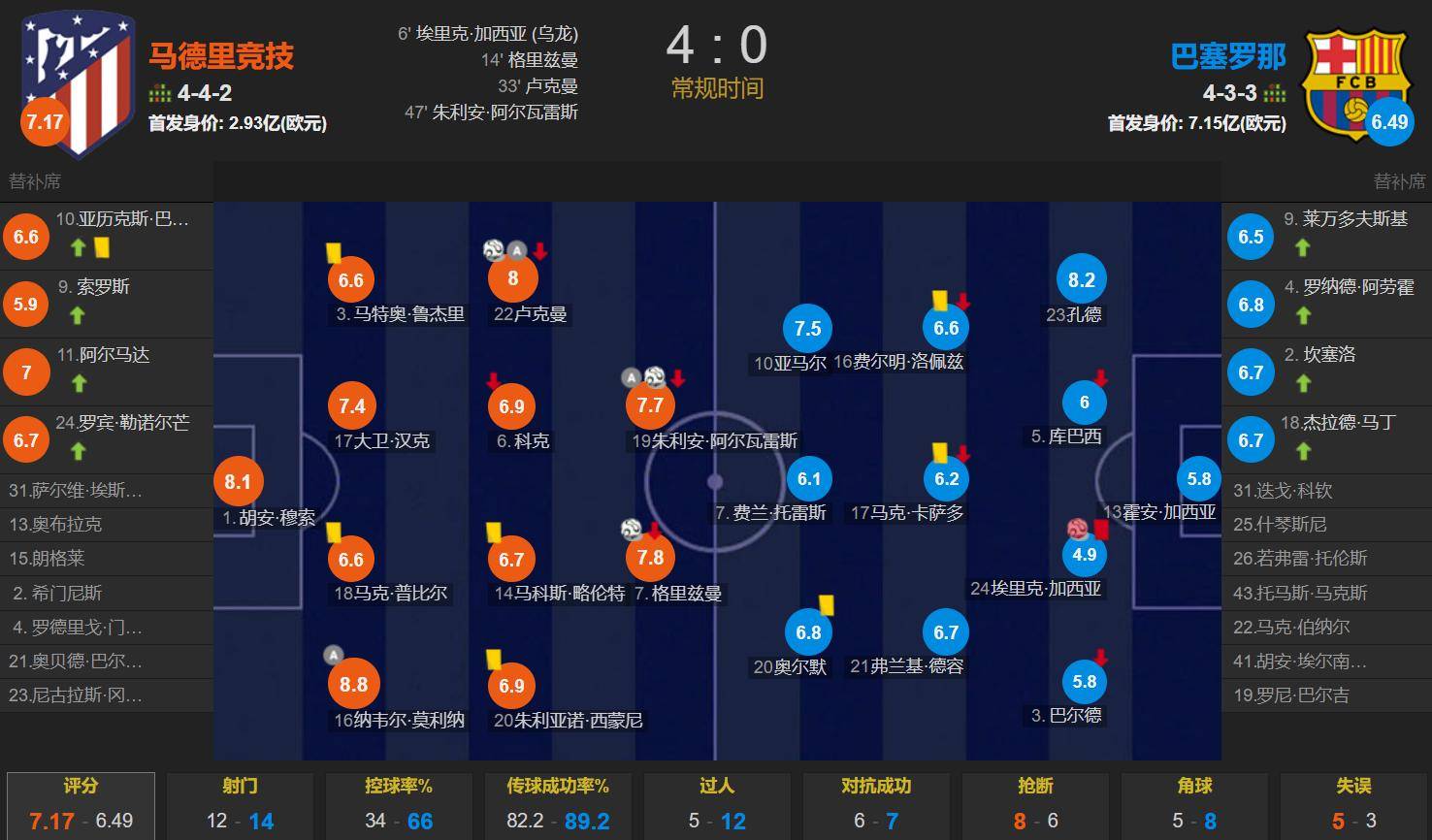 บาร์เซโลน่าทั้งเกมรุกและเกมรับต่างก็ย่ำแย่ในนัดนี้ เฟร์รานเป็นกองหน้าที่ไม่สามารถจบสกอร์จากโอกาสง่ายๆ ได้เลย - มันน่าฉงนว่าเขาสามารถอยู่กับบาร์ซ่ามาได้นานขนาดนี้ได้อย่างไร นั่นเป็นความผิดพลาดครั้งใหญ่ของฝ่ายบริหารของสโมสร แนวรับเป็นความวุ่นวายอย่างสิ้นเชิง โดยมีผู้เล่นตัวจริงสามคนที่ได้รับคะแนนต่ำกว่ามาตรฐาน: แบ็คซ้าย บัลเด, เซ็นเตอร์แบ็ค การ์เซีย-เอริค และผู้รักษาประตู โฆอัน การ์เซียบาร์ซ่าขาดผู้เล่นจบสกอร์ที่แท้จริงในแดนหน้า ขณะที่ฝั่งซ้ายของพวกเขากลายเป็นจุดอ่อนอย่างต่อเนื่อง แอตเลติโก มาดริด ถล่มคู่แข่งด้วยสี่ประตูในครึ่งแรก นักเตะใหม่ วิลเลียม ลูคแมน สร้างความสดใหม่และพลังให้กับทีม โดยประสานงานกับ อังเคล อัลบาเรซ ทั้งยิงและแอสซิสต์ ขณะที่นักเตะมากประสบการณ์อย่าง อองตวน กรีซมันน์ ก็ทำประตูได้เช่นกันในนัดแรกของรอบรองชนะเลิศโกปา เดล เรย์ แอตเลติโก มาดริด ถล่มบาร์เซโลนา 4-0 ทั้งสี่ประตูเกิดขึ้นในครึ่งแรกขณะที่ทั้งสองทีมยังเล่นกันครบกำลังหลัก แสดงให้เห็นถึงความย่ำแย่ของบาร์เซโลนาในนัดนี้อย่างชัดเจน เมื่อขาดผู้เล่นคนสำคัญอย่าง เปดรี ทีมบาร์ซ่าก็ดูอ่อนแรงลงทันที