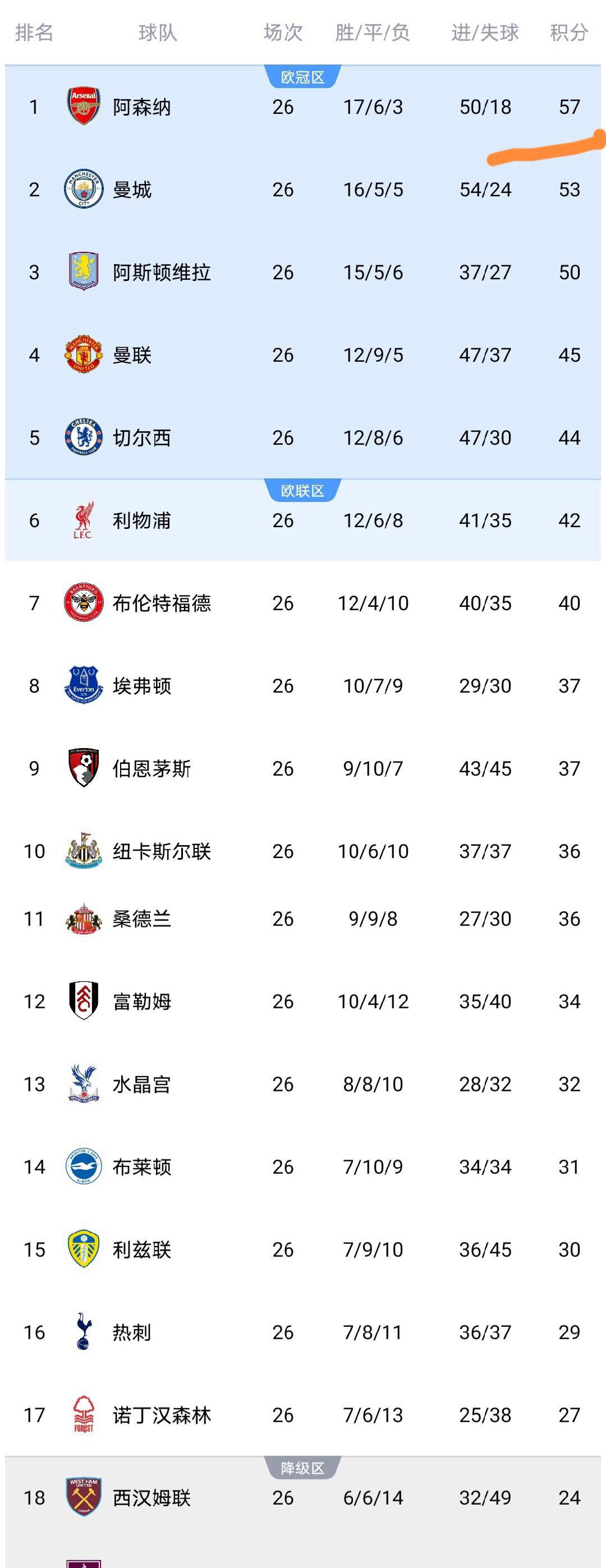 จากการจับสลากครั้งนี้ อาร์เซนอลยังคงรั้งจ่าฝูงด้วย 57 คะแนน แต่ช่องว่างกับแมนเชสเตอร์ ซิตี้ลดลงอย่างมากเหลือเพียง 4 คะแนนเท่านั้น ขณะเดียวกัน แอสตัน วิลล่า ทีมอันดับสาม ไล่จี้มาเหลือเพียง 7 คะแนน จุดประกายการแข่งขันชิงแชมป์พรีเมียร์ลีกอีกครั้ง แม้จะยังคงนำเป็นจ่าฝูง แต่ อาร์เซนอลต้องเผชิญกับแรงกดดันที่เพิ่มขึ้นในการรักษาแชมป์ ขณะที่ทั้งซิตี้และวิลล่าต่างแสดงให้เห็นถึงแรงขับเคลื่อนที่น่าเกรงขาม เพิ่มโอกาสในการลุ้นแชมป์อย่างมากเห็นได้ชัดว่าการสะดุดของอาร์เซนอลทำให้แมนเชสเตอร์ซิตี้และแอสตันวิลล่ากลายเป็นผู้ได้รับประโยชน์สูงสุดในรอบนี้ ในขณะเดียวกัน เบรนท์ฟอร์ดได้สะสมคะแนนถึง 40 คะแนนแล้ว ไล่จี้ลิเวอร์พูลที่อยู่อันดับหกซึ่งตอนนี้ต้องเผชิญกับแรงกดดันในการแข่งขันอย่างมาก