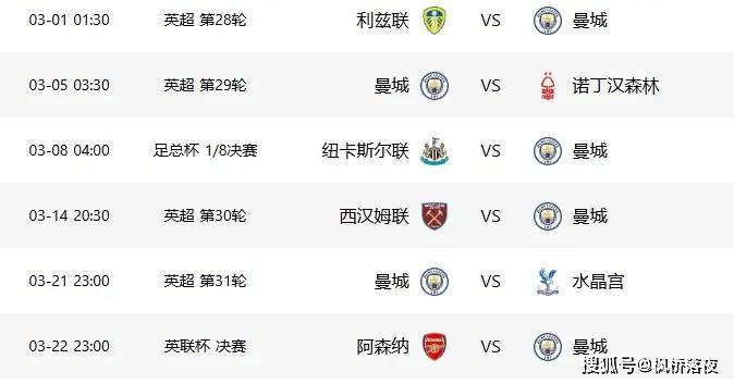 โปรแกรมการแข่งขัน 6 นัดถัดไปของแมนเชสเตอร์ ซิตี้: ลีดส์ ยูไนเต็ด (15), น็อตติ้งแฮม ฟอเรสต์ (17), เวสต์แฮม ยูไนเต็ด (18), คริสตัล พาเลซ (14), เชลซี (4), อาร์เซนอล (1)