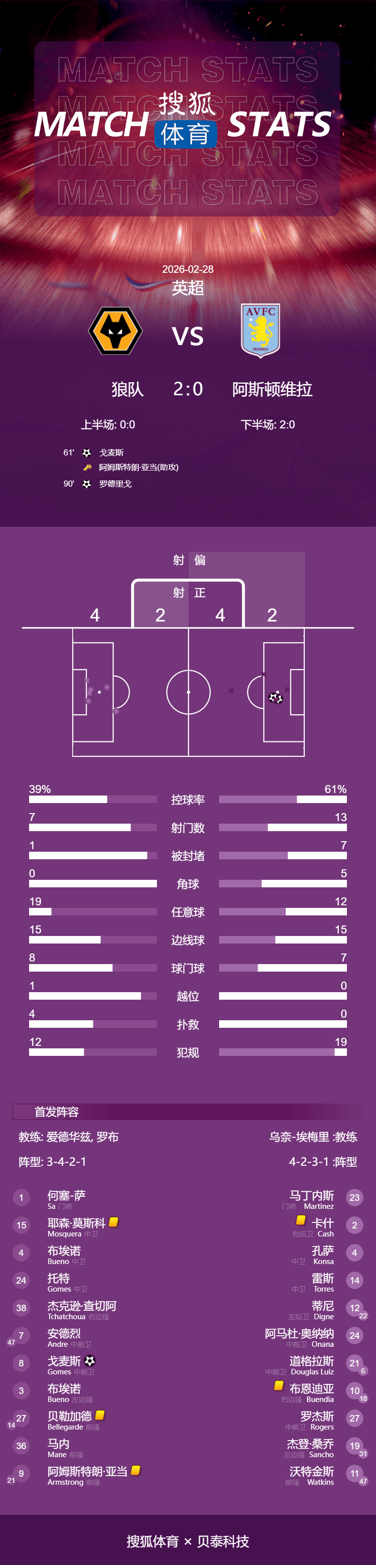 เมื่อวันที่ 28 กุมภาพันธ์ เวลาปักกิ่ง ในรอบที่ 28 ของฤดูกาลพรีเมียร์ลีก 2025-2026 วูล์ฟแฮมป์ตัน วันเดอร์เรอร์ส ซึ่งปัจจุบันอยู่อันดับสุดท้ายของตาราง สามารถคว้าชัยชนะในบ้านได้อย่างเด็ดขาดด้วยสกอร์ 2-0 เหนือแอสตัน วิลล่า ในครึ่งแรก ออลลี่ วัตคินส์ พลาดโอกาสทองในการทำประตูขึ้นนำ หลังจากพักครึ่ง โจอาน กอเมส และโรดรีโก กอเมส ทำประตูให้เจ้าบ้านได้สำเร็จ