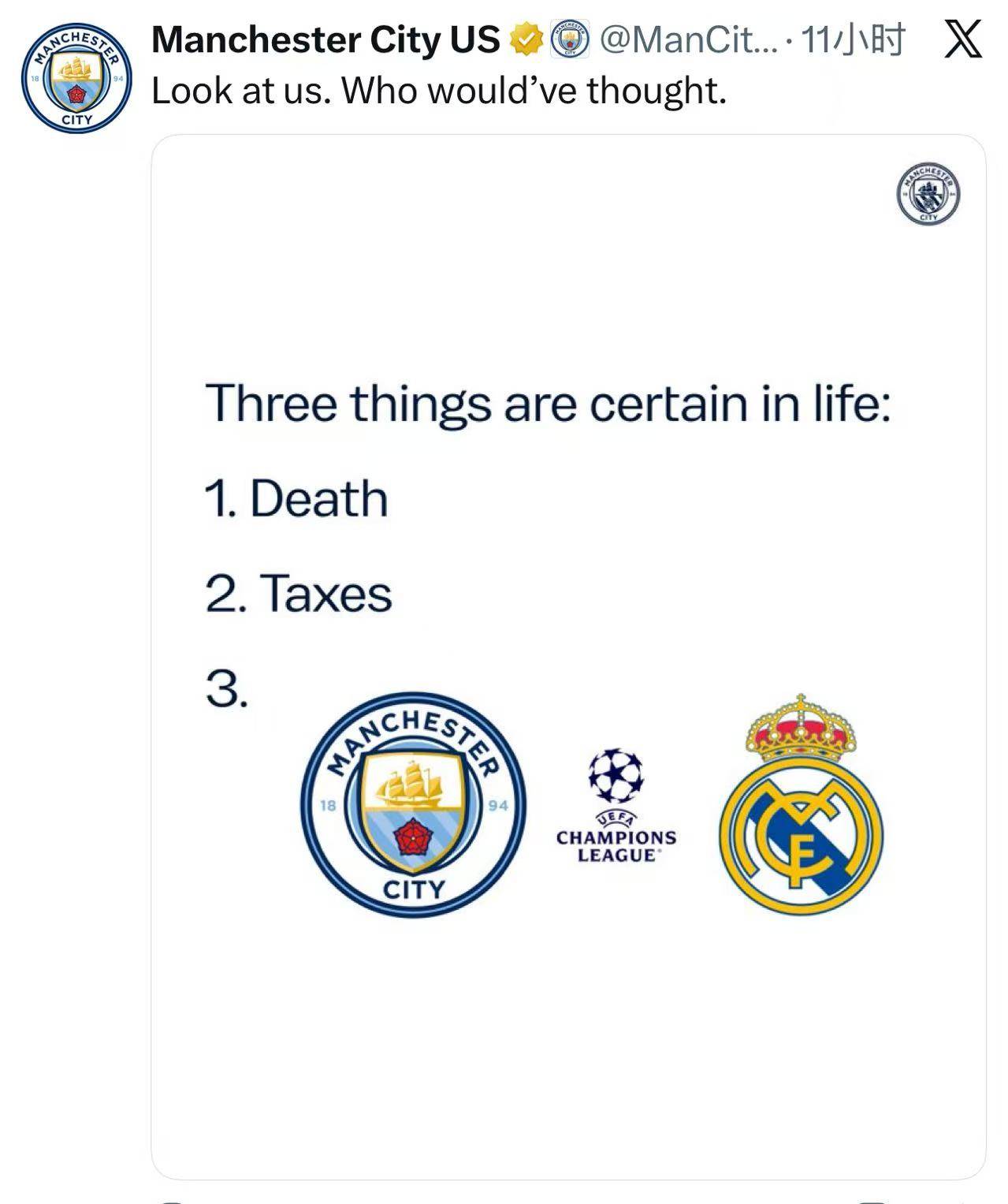 จากผลการจับสลาก แมนเชสเตอร์ ซิตี้ ได้โพสต์บนทวิตเตอร์อย่างเป็นทางการในสหรัฐอเมริกาว่า: "สามสิ่งที่แน่นอนในชีวิต: ความตาย, ภาษี, และการเผชิญหน้ากับเรอัล มาดริดในแชมเปียนส์ลีก"