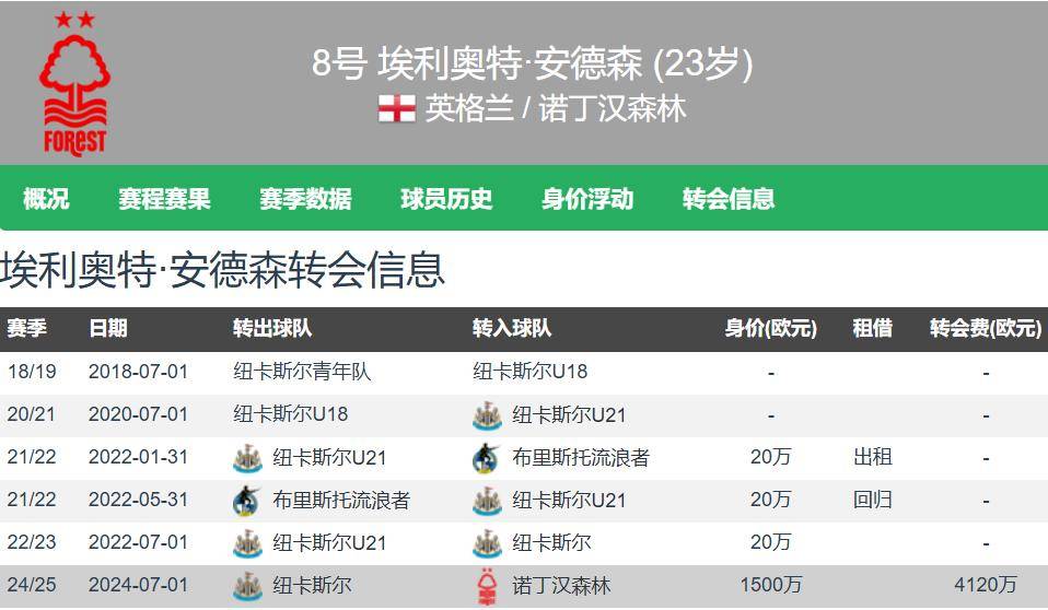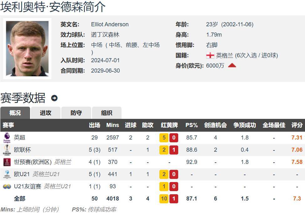 เอลเลียต แอนเดอร์สัน วัย 23 ปี สูง 1.79 เมตร และมีผู้เล่นเท้าขวา เขาสามารถเล่นกองกลาง กองกลาง และมิดฟิลด์ซ้ายได้ ประมาณการโอนเงินของเยอรมันคือ 60 ล้านยูโร เป็นมูลค่าที่สองของ Nottingham Forest รองจาก Gibbs White เพียง 65 ล้านยูโร สัญญากับน็อตติงแฮมฟอเรสต์จะเป็นปี 2029 เอลเลียต-แอนเดอร์สันลงเล่น 29 ครั้งในพรีเมียร์ลีกในฤดูกาลนี้ โดยทั้งหมดเริ่มต้น 2 ประตู 2 แอสซิสต์ และยูโรปาลีกลงเล่น 8 ครั้ง รวมถึง 5 ตัวจริงและ 1 แอสซิสต์