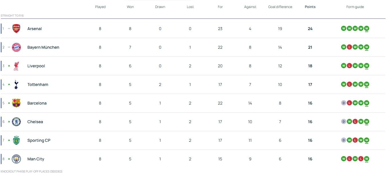 6 ทีม ผ่านเข้ารอบ 16 อันดับแรกของแชมเปี้ยนส์ลีก! พรีเมียร์ลีก 4 ทีม ห่างไป 5 แต้มจาก 5 อันดับแรก และฤดูกาลหน้าอาจตั้ง 7 ทีมเข้าร่วมการแข่งขันแชมเปี้ยนส์ลีก_อาร์เซนอล_ยูโรปาลีก