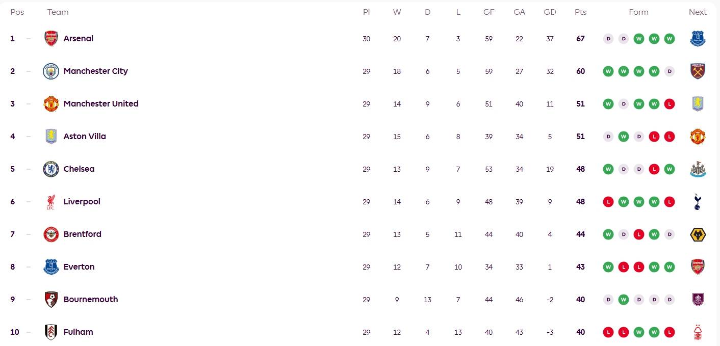 ตอนนี้ความสงสัยที่ยิ่งใหญ่ที่สุดในพรีเมียร์ลีกคือห้าอันดับแรก แมนเชสเตอร์ยูไนเต็ดและแอสตันวิลล่ามี 51 คะแนนเท่ากัน โดยอยู่ในอันดับที่สามและสี่ตามลำดับ เชลซี ลิเวอร์พูล มี 48 แต้มเท่ากัน และทั้งสองทีมอยู่ในอันดับที่ 5 และ 6 ความแตกต่างระหว่างสี่ทีมนี้มีเพียง 3 แต้ม และจะแข่งขันกันเพื่อสามแห่งเพื่อเข้าร่วมแชมเปี้ยนส์ลีก