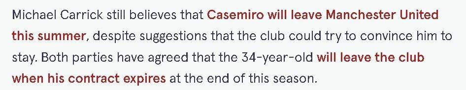 ฟาบริซิโอ โรมาโน ผู้เชี่ยวชาญด้านการย้ายทีมชาวอิตาลี ยืนยันว่า แมนเชสเตอร์ ยูไนเต็ด ไม่ได้ติดต่อเคซีมิลโลเพื่อรักษาเขาไว้ “จากมุมมองของแฟนบอล เป็นเรื่องที่น่าสนใจโดยธรรมชาติที่จะปล่อยให้ผู้เล่นมีประสบการณ์แชมเปียนส์ลีกที่ร่ำรวย” “แต่คาเซมิโร่ตัดสินใจออกจากแมนเชสเตอร์ ยูไนเต็ด ไปตั้งแต่ช่วงเดือนมกราคมที่ผ่านมา ซึ่งเป็นคำแถลงอย่างเป็นทางการ ไม่ใช่ข่าวลือหรือข้อตกลงด้วยวาจา คาเซมิโร่ได้ตัดสินใจแล้ว”