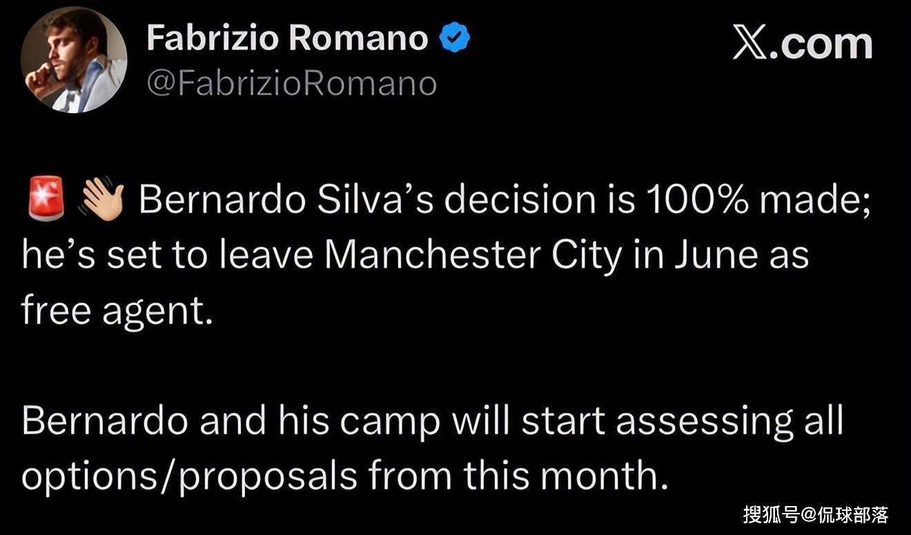 เมื่อวันที่ 3 เมษายน ตามเวลาปักกิ่ง โรมาโน่ ผู้เชี่ยวชาญด้านการย้ายทีมชื่อดัง โรมาโน ยืนยันในโซเชียลมีเดียว่า บีซี กัปตันทีม แมน ซิตี้ วัย 31 ปี (เบลาร์โด ซิลวา) ได้รับการยืนยัน 100% ว่าเขาจะออกจากแมนเชสเตอร์ ซิตี้ อย่างอิสระในช่วงซัมเมอร์นี้