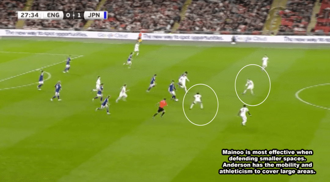 เมื่อเมโน่และแอนเดอร์สันเข้าคู่กัน สถานการณ์ก็คล้ายกับแมนเชสเตอร์ ยูไนเต็ด และคาเซมิโร่ เมโน่อยู่ทางซ้ายและจะถูกบังคับไปข้างหน้าโดยไม่มีลูกบอลเพราะเขาเก่งแค่พื้นที่ป้องกัน แอนเดอร์สันอยู่ข้างหลังวังทางขวาซึ่งรับผิดชอบภารกิจการป้องกันส่วนใหญ่
