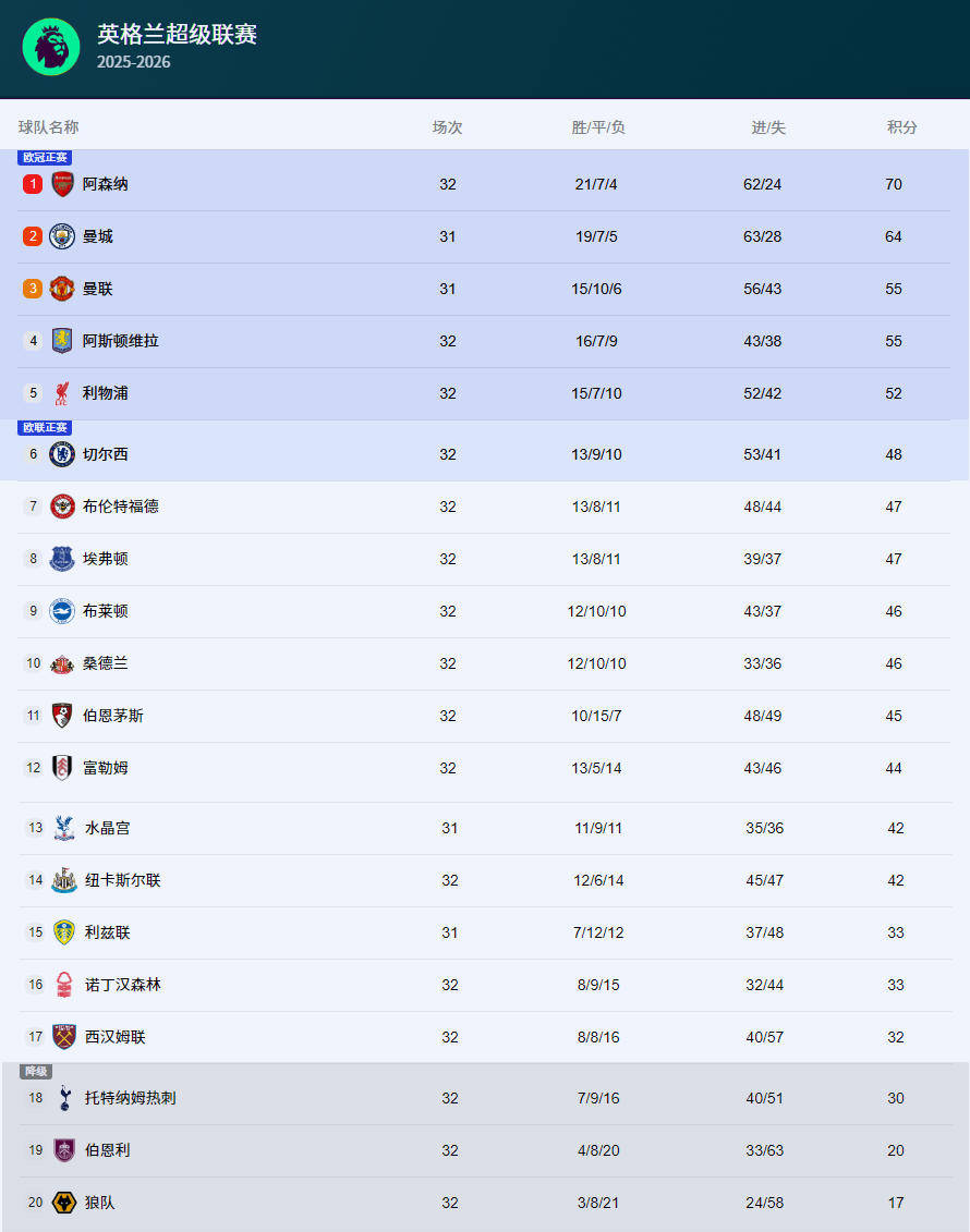 เมื่อวันที่ 12 เมษายน 2026 ตามเวลาปักกิ่ง รอบที่ 32 ของพรีเมียร์ลีกได้นำเกมโฟกัส และเชลซีเผชิญหน้ากับแมนเชสเตอร์ ซิตี้ ที่บ้านที่สแตมฟอร์ด บริดจ์ ท้ายที่สุดด้วยประตูของโอเรลี กาย และโดคู แมนเชสเตอร์ ซิตี้ เอาชนะ เชลซี ไป 3-0 ทิ้งให้เชลซีต้องทนทุกข์กับเกมที่แพ้ติดต่อกันมาสามเกมในลีก แม้ว่าจะเล่นน้อยลงหนึ่งเกม แต่หลังจากชัยชนะของแมนเชสเตอร์ซิตี้เขายังคงตามหลังอาร์เซนอล 6 แต้มในอันดับและความสงสัยในการแข่งขันชิงแชมป์พรีเมียร์ลีกกำลังเกิดขึ้นอีกครั้ง!