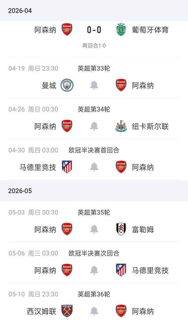 ไม่ใช่เรื่องง่ายสำหรับทีมยุโรปที่แข็งแกร่งเพราะการรบสองบรรทัดนั้นต้องไม่เพียง แต่ต้องรับประกันการเลื่อนตำแหน่งของแชมเปี้ยนส์ลีกเท่านั้น แต่ยังคำนึงถึงแชมป์ลีกด้วย ในรอบรองชนะเลิศแชมเปี้ยนส์ลีก รอบรองชนะเลิศ อาร์เซนอล เสมอ 0-0 ในบ้านกับกีฬาโปรตุเกส และผ่านเข้ารอบรองชนะเลิศของแชมเปี้ยนส์ลีกได้สำเร็จด้วยคะแนนรวม 1-0 และจะเล่นแอตเลติโก มาดริดในรอบรองชนะเลิศ ความผิดของอาร์เซนอลในแคมเปญนี้เป็นเรื่องยุ่งเหยิงจริงๆ แต่พวกเขาก้าวหน้า และสุดสัปดาห์นี้เวลา 23:30 น. ของวันที่ 19 เมษายน ตามเวลาปักกิ่ง เราเริ่มการต่อสู้เพื่อชิงแชมป์ในรอบที่ 33 ของพรีเมียร์ลีก และแมนเชสเตอร์ ซิตี้ เล่นกับอาร์เซนอลที่บ้าน
