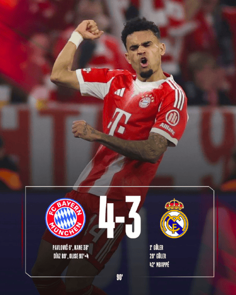 ในนาทีที่ 94 เรอัล มาดริด ได้ผลักดันครั้งใหญ่แล้วก็ป้องกันจากพื้นที่ว่าง โอลิเซ่ยิงชัยชนะได้ทางขวา 4-3 อย่างง่ายดาย และบาเยิร์นมีคะแนนรวม 6-4 ในการกำจัดเรอัล มาดริด