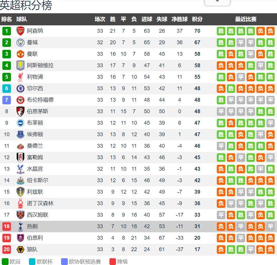 - 热刺:7胜10平16负积31分排名第十六,深陷降级区,近15轮未尝胜绩。