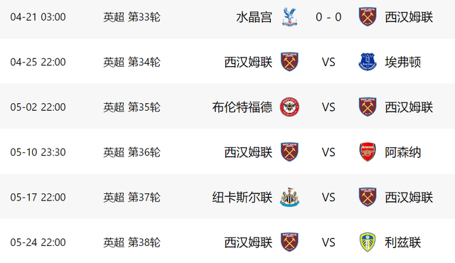เมื่อวันที่ 21 เมษายน ตามเวลาปักกิ่ง ในเกมสุดท้ายของรอบ 33 ของพรีเมียร์ลีก เวสต์แฮม เล่นเป็นแขกรับเชิญกับคริสตัล พาเลซ แคมเปญนี้เกี่ยวข้องกับการตกชั้น เวสต์แฮมทำการโจมตีทั้งหมด และในที่สุดก็ดึง 0-0 กับคู่ต่อสู้ของเขาและทำคะแนนได้ 1 แต้ม