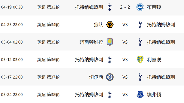 โชคดีที่ท็อตแนมยังมีความหวังที่จะเปลี่ยนชีวิตของมันกับท้องฟ้า ตามตารางการแข่งขันในรอบ 5 ทีมสุดท้าย ฝ่ายตรงข้ามของท็อตแนมคือ วูล์ฟส์, วิลา, ลีดส์ ยูไนเต็ด, เชลซี และ เอฟเวอร์ตัน ในหมู่พวกเขามันยากที่จะได้แต้มกับ เวร่า และ เชลซี เยือนจากเกมเยือน แต่ในอีก 3 เกม หากท็อตแน่มเล่นได้ปกติมีโอกาสได้ทั้งหมด 9 แต้ม โดยเฉพาะในรอบต่อไป ท็อตแน่ม ฮ็อตสเปอร์ เป็นแขกรับเชิญที่ตกชั้นไปล่วงหน้า ถ้าพวกเขาไม่ได้ 3 แต้ม ท็อตแนมก็อย่าคาดหวังว่าจะถูกผลักไส
