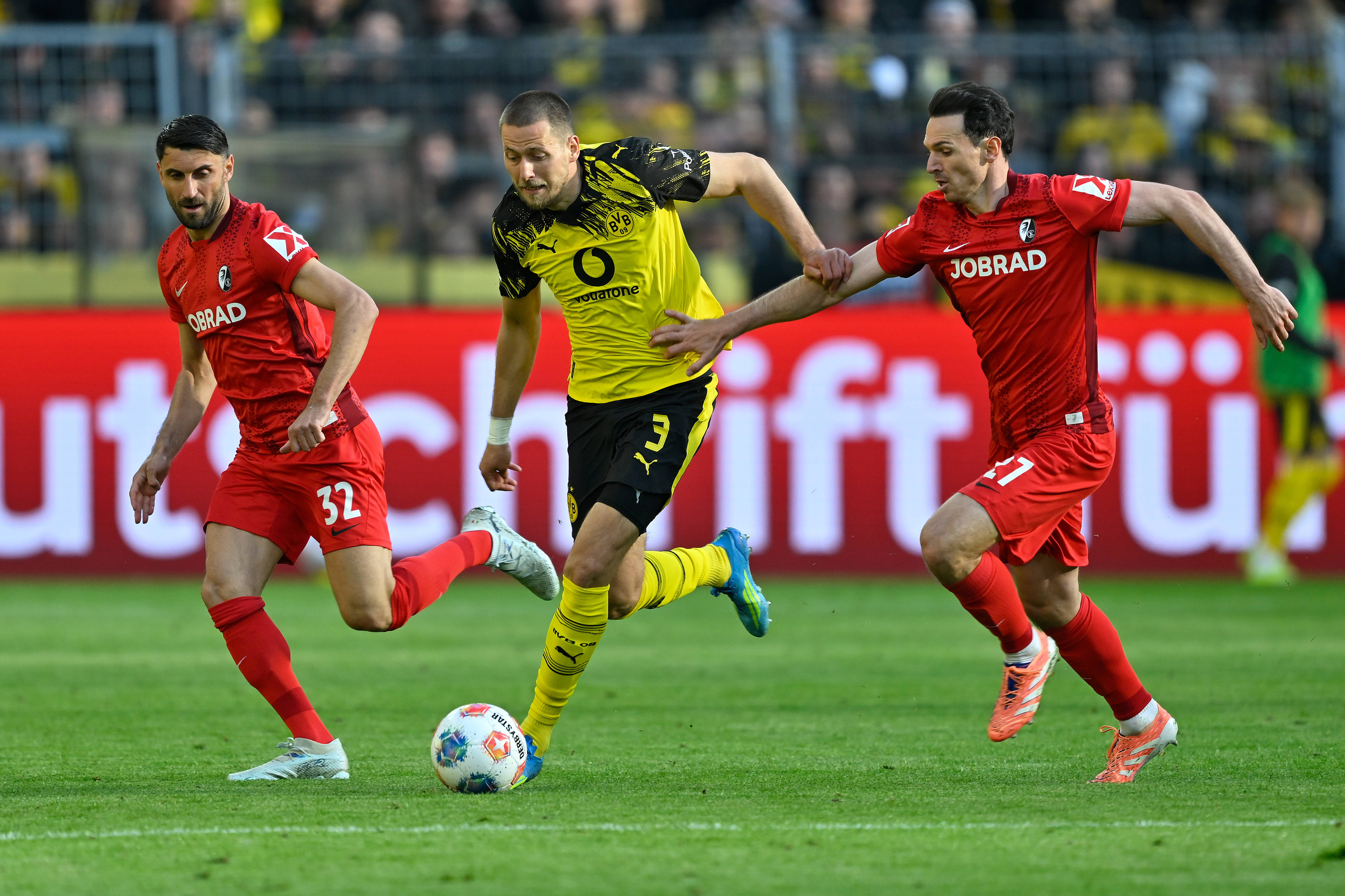เมื่อวันที่ 26 เมษายน ผู้เล่นดอร์ทมุนด์ Inasio (ขวา) และผู้เล่น Freiburg ได้ต่อสู้กันในเกม สำนักข่าวซินหัว (ภาพโดย Ulrich Hufnagher)