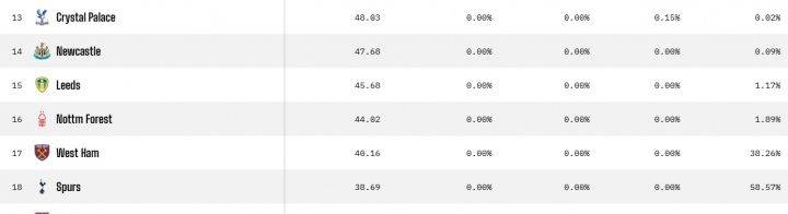 โมเดลซูเปอร์คอมพิวเตอร์ของหน่วยงานข้อมูลที่รู้จักกันดี Opta ได้ปรับปรุงความน่าจะเป็นของการปรับลดรุ่นของแต่ละทีมและผลการวิจัยแสดงให้เห็นว่าสถานการณ์การตกชั้นเป็นโพลาไรซ์: ความเสี่ยงดาวน์เกรดของ Crystal Palace และ Newcastle United นั้นเกือบจะเป็นศูนย์และมีเพียง 0 ตามลำดับ 02% และ 0 09%; Nottingham Forest และ Leeds ใช้ความคิดริเริ่มและความน่าจะเป็นที่ปรับลดระดับคือ 1.89% และ 1.17% ตามลำดับ ความน่าจะเป็นที่ปรับลดอันดับของ West Ham United อยู่ที่ประมาณ 38% และความเสี่ยงในการตกชั้นของ Tottenham นั้นสูงถึง 58% ซึ่งเป็นหนึ่งในทีมที่อันตรายที่สุดใกล้กับเขตตกชั้น Burnley และ Wolves ได้ล็อคตำแหน่งตกชั้นไว้ล่วงหน้าแล้วและมีโอกาสอยู่ที่ 100%