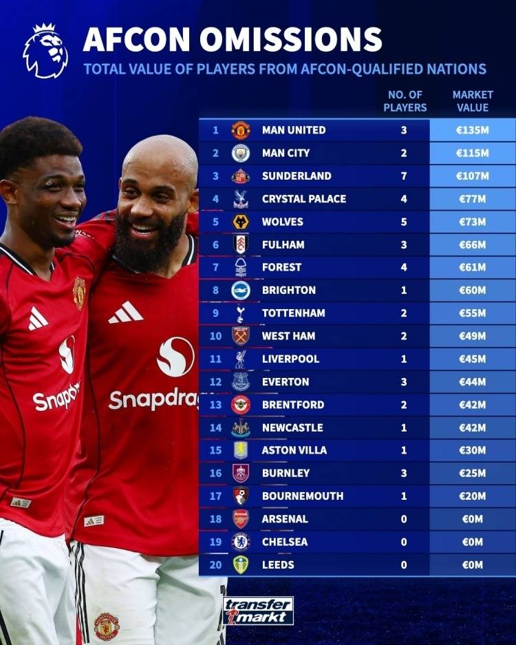 Transfermarkt ได้เผยแพร่รายงานสถิติที่น่าสนใจซึ่งระบุมูลค่าตลาดรวมของผู้เล่นจากสโมสรในพรีเมียร์ลีกที่มีกำหนดจะเข้าร่วมการแข่งขันแอฟริกา คัพ ออฟ เนชั่นส์ การจัดอันดับนี้แสดงให้เห็นอย่างชัดเจนถึงผลกระทบของการแข่งขันต่อทีมชั้นนำของอังกฤษ แมนเชสเตอร์ ยูไนเต็ด ครองอันดับหนึ่งด้วยมูลค่ารวมของผู้เล่น 135 ล้านยูโร ตามมาด้วยแมนเชสเตอร์ ซิตี้ ที่ 115 ล้านยูโรน่าประหลาดใจที่ซันเดอร์แลนด์อยู่ในอันดับที่สามด้วยมูลค่ารวมของผู้เล่นที่ €107 ล้าน โดยมีผู้เล่นถึงเจ็ดคนที่เตรียมจะลงแข่งขันในทัวร์นาเมนต์นี้