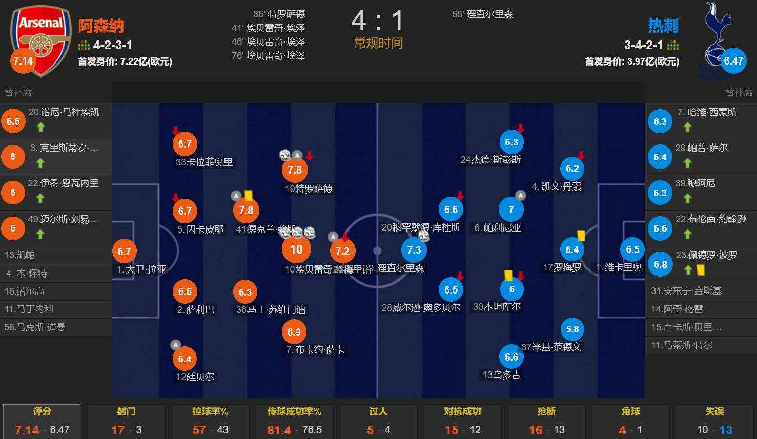 ในแง่ของเกมการแข่งขัน อาร์เซนอลเหนือกว่าท็อตแน่มในทุกด้านอย่างชัดเจน คว้าชัยชนะที่สมควรได้รับอย่างแท้จริง เอเซ้ นักเตะใหม่ยิงแฮตทริกและได้รับคะแนนเต็ม 10/10 หลังจบเกม ด้วยชัยชนะของอาร์เซนอลในรอบนี้ ทำให้พวกเขาทิ้งห่างลิเวอร์พูลและแมนเชสเตอร์ซิตี้ถึง 6 คะแนน ซึ่งถือเป็นผลลัพธ์ที่สมบูรณ์แบบ อย่างไรก็ตาม มิเกล อาร์เตต้า ยังเผยให้เห็นจุดอ่อน นั่นคือความลังเลในการเปลี่ยนตัวผู้เล่นในขณะที่อาร์เซนอลนำอยู่ 4-1 ในช่วงนาทีที่ 80 มิเกล อาร์เตต้ายังคงไม่เปลี่ยนตัวผู้เล่นแม้แต่น้อย ทำให้ผู้เล่นสำรองไม่มีโอกาสลงสนามและไม่สามารถพักผู้เล่นหลักได้เมื่อต้องเผชิญกับสามนัดในเจ็ดวันกับท็อตแน่ม ฮ็อตสเปอร์, บาเยิร์น มิวนิค และเชลซีความลังเลของอาร์เตต้าที่จะหมุนเวียนผู้เล่นเพิ่มความเสี่ยงต่อการบาดเจ็บของผู้เล่นหลักเนื่องจากความเหนื่อยล้าสะสมตำแหน่งกองหน้าตัวเป้าของอาร์เซนอลยังคงไม่ได้รับการแก้ไข แม้ว่าเมรีโน่จะเข้ามาทำหน้าที่ได้อย่างมีประสิทธิภาพ โดยทำผลงานเหมือนกองหน้าตัวเป้าแม้จะไม่ใช่ตำแหน่งนี้ก็ตาม ด้วยการที่กาเบรียลได้รับบาดเจ็บ นักเตะใหม่ที่มีศักยภาพอย่างอินคา-พายได้เข้ามาเติมเต็มช่องว่างนี้ได้เป็นอย่างดี อย่างไรก็ตาม อาร์เซนอลยังขาดผู้เล่นที่เหมาะสมที่จะมาแทนที่ตำแหน่งของไรซ์ การแข่งขันชิงแชมป์พรีเมียร์ลีกเป็นเหมือนมาราธอน ไม่ใช่การวิ่งระยะสั้น อาร์เตต้าจำเป็นต้องหมุนเวียนผู้เล่นในทีมอย่างเหมาะสมเพื่อปกป้องนักเตะคนสำคัญของเขา นั่นคือสิ่งที่ทีมที่มีศักยภาพในการคว้าแชมป์ควรเป็น