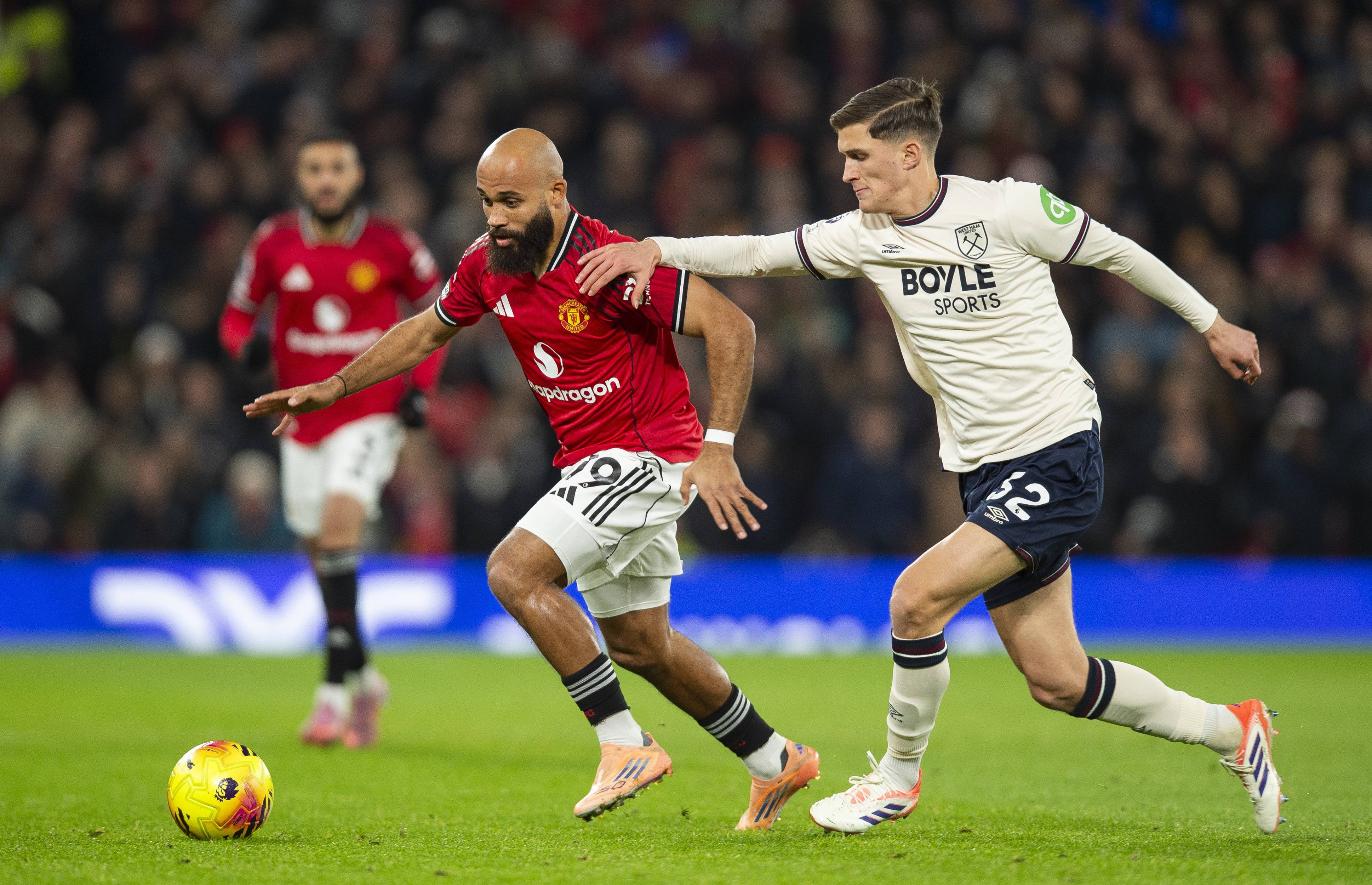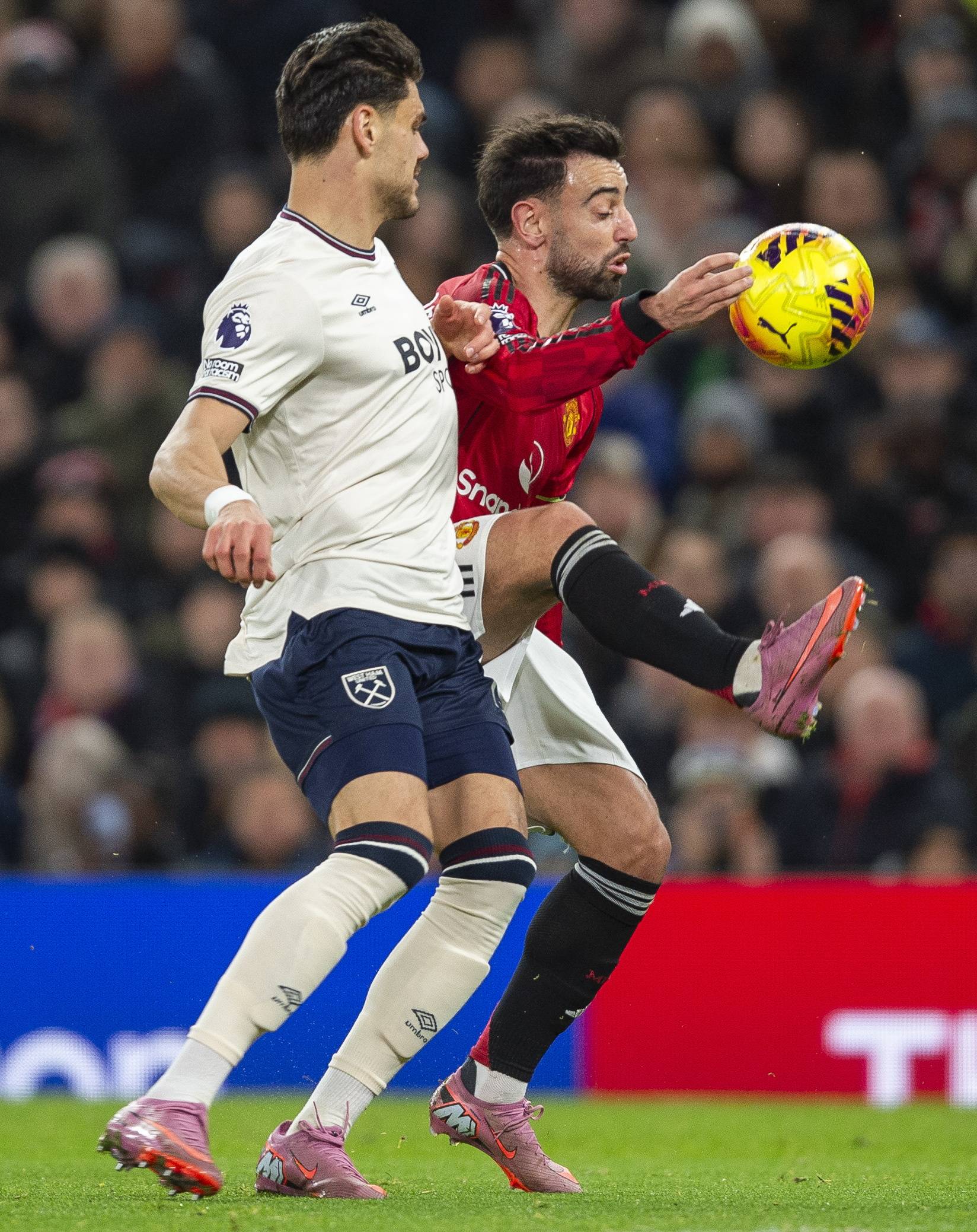 เมื่อวันที่ 4 ธันวาคม เฟร์นันเดสของแมนเชสเตอร์ ยูไนเต็ด (ขวา) เข้าปะทะกับมาฟโรปานอสของเวสต์แฮม ยูไนเต็ด เพื่อแย่งบอล. ซีเอ็นเอ็น/อีพีเอ