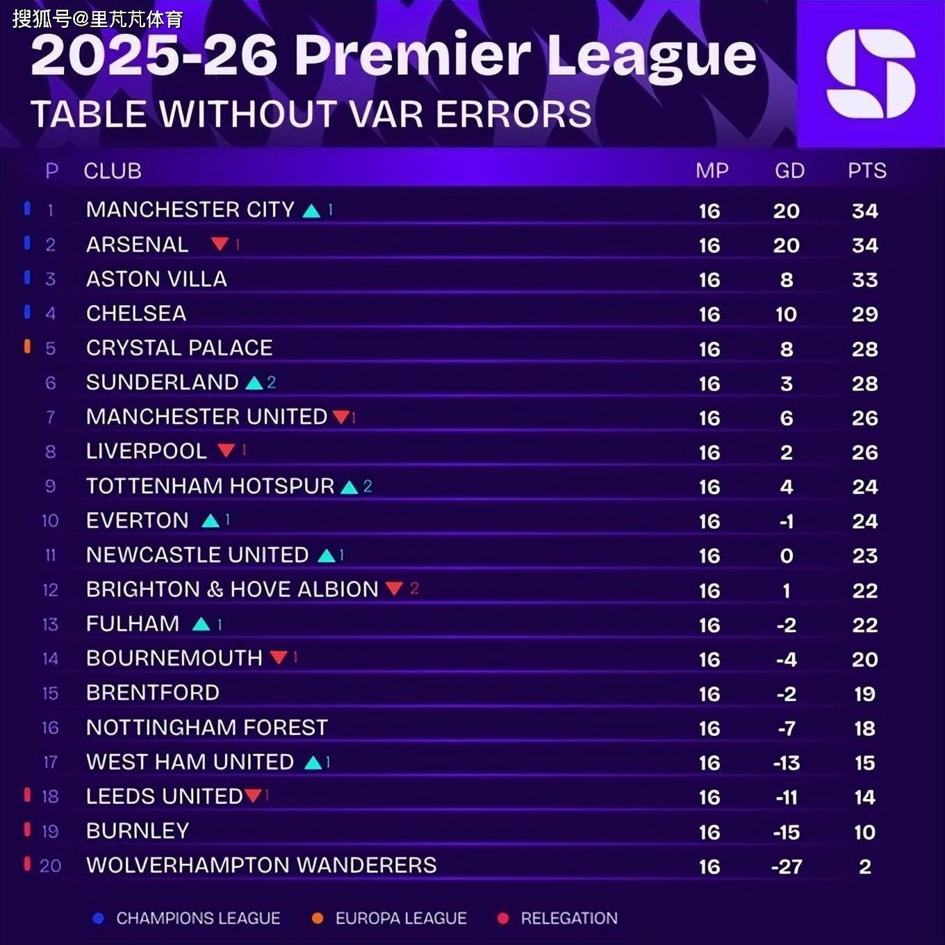 สถิติของ Squawka แสดงอันดับพรีเมียร์ลีกหลังจากพิจารณาข้อผิดพลาดของ VAR โดยแมนเชสเตอร์ซิตี้และอาร์เซนอลครองตำแหน่งสองอันดับแรก
