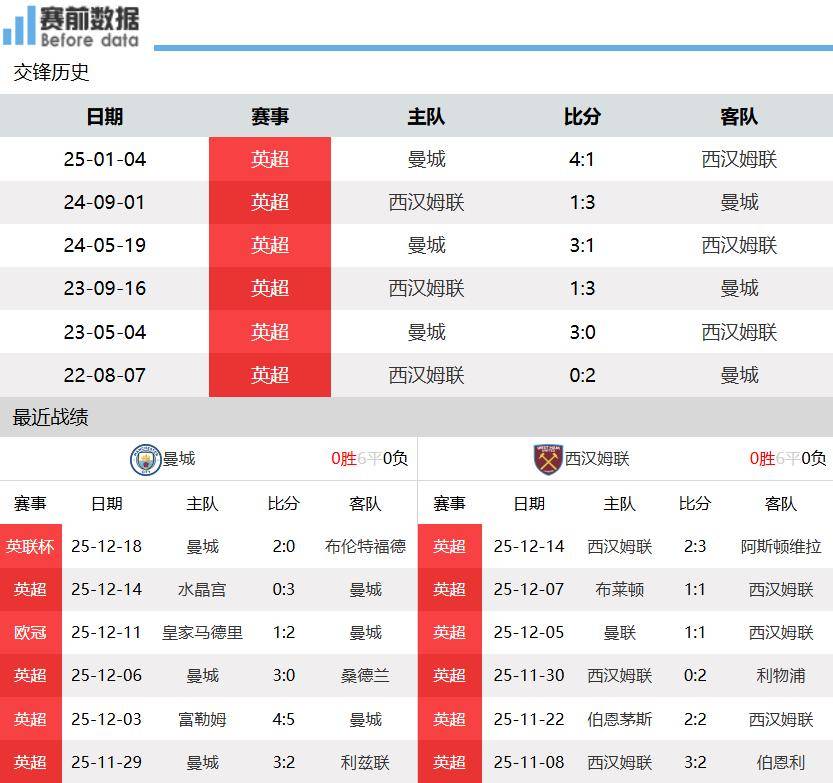 ประการแรก:สถานการณ์ของทีม! หลังจากผ่านไป 16 นัดในพรีเมียร์ลีก แมนเชสเตอร์ ซิตี้ อยู่ในอันดับที่สองด้วยคะแนน 34 คะแนน จากการชนะ 11 นัด เสมอ 1 นัด และแพ้ 4 นัด ตามหลังผู้นำเพียง 2 คะแนน ขณะที่ เวสต์แฮม ยูไนเต็ด อยู่ในอันดับที่ 18 ด้วยคะแนน 13 คะแนน จากการชนะ 3 นัด เสมอ 4 นัด และแพ้ 9 นัด อยู่ในโซนตกชั้นอย่างเหนียวแน่นในการแข่งขันพรีเมียร์ลีกนัดล่าสุด แมนเชสเตอร์ ซิตี้ คว้าชัยชนะอย่างเด็ดขาด 3-0 จากเกมเยือนคริสตัล พาเลซ ขยายสถิติชนะติดต่อกันในทุกรายการเป็น 5 นัด ในกลางสัปดาห์ พวกเขาเอาชนะเบรนท์ฟอร์ด 2-0 อย่างสบายๆ ในบ้านในศึกคาราบาวคัพ ขณะที่เวสต์แฮม ยูไนเต็ด พ่ายแพ้คาบ้าน 2-3 ต่อแอสตัน วิลล่า ทำให้พวกเขาไม่ชนะใครติดต่อกันเป็น 3 นัดเสมอ 2 นัด และแพ้ 2 นัดใน 5 นัดล่าสุดของลีก