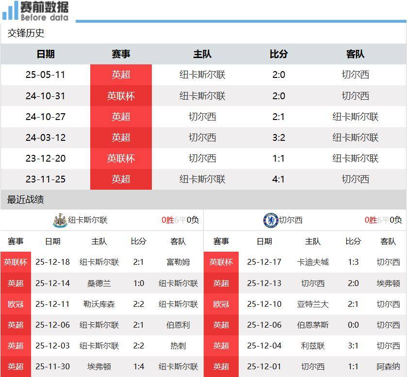 เวลา 20:30 น. ตามเวลาปักกิ่ง วันที่ 20 ธันวาคม นิวคาสเซิล ยูไนเต็ด เปิดบ้านรับการมาเยือนของเชลซี ในรอบที่ 17 ของพรีเมียร์ลีก