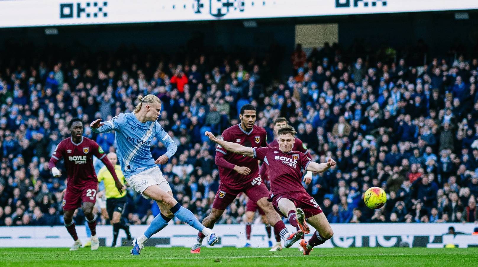 ในนาทีที่ 56 เวสต์แฮม ยูไนเต็ด เปิดเกมโต้กลับอย่างรวดเร็ว โบเวนเลี้ยงบอลขึ้นทางฝั่งขวาและเข้าสู่กรอบเขตโทษ ก่อนจะยิงบอลแฉลบต่ำจากมุมแคบ แต่บอลเฉียดเสาออกไปอย่างน่าเสียดาย พลาดโอกาสทองไปอย่างน่าเสียดายในนาทีที่ 68 ซาวิโญ่ ตัวสำรอง หลุดเข้าไปทางริมเส้นฝั่งขวาและเปิดบอลต่ำเข้ามา ลูอิสแตะบอลเปลี่ยนทาง และฮาแลนด์วิ่งมาที่เสาไกล ความผิดพลาดของแนวรับเวสต์แฮมทำให้ฮาแลนด์ยิงโล่งๆ เข้าไปอย่างง่ายดาย เป็นของขวัญจากผู้รักษาประตู ส่งให้แมนเชสเตอร์ ซิตี้ นำห่าง 3-0ในนาทีที่ 76 ซามูเอลสันยิงลูกกระหน่ำจากตำแหน่งกลางสนามโดนดอนนารุมมาปัดออกไปได้ ในช่วงทดเวลาบาดเจ็บ โฟเดนจ่ายบอลทะลุช่องให้ฮาแลนด์ยิงระยะประชิดจากในกรอบเขตโทษ แต่บอลเฉียดเสาออกไปอย่างหวุดหวิด ทำให้เขาพลาดโอกาสทำแฮตทริก แมนเชสเตอร์ ซิตี้คว้าชัยชนะอย่างขาดลอย 3-0 เหนือเวสต์แฮม ยูไนเต็ด