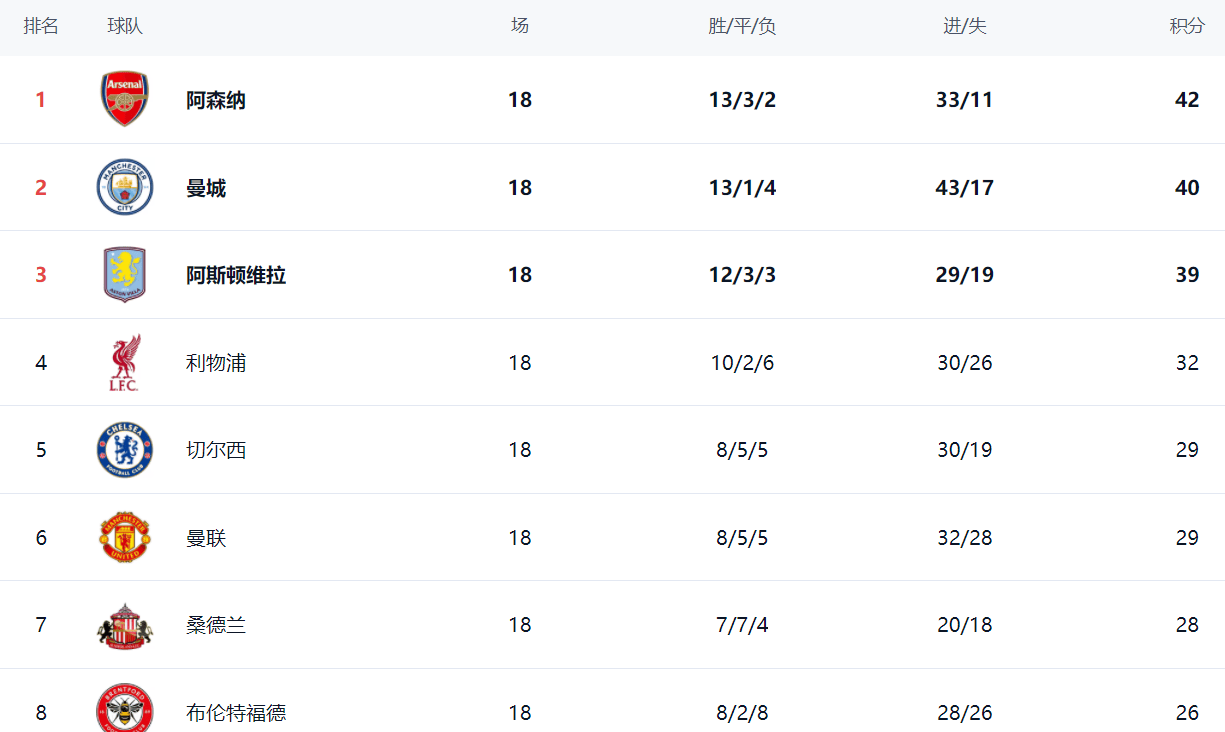 ในตารางลีก อาร์เซนอลมีสถิติชนะ 13 นัด เสมอ 3 นัด และแพ้ 2 นัด คว้าตำแหน่งจ่าฝูงด้วย 42 คะแนน อย่างไรก็ตาม ความได้เปรียบของพวกเขายังคงน้อย โดยแมนเชสเตอร์ ซิตี้ ตามมาติด ๆ ซิตี้มี 40 คะแนน อยู่ในอันดับสอง ตามหลังเดอะกันเนอร์สเพียงสองคะแนนเท่านั้นแอสตัน วิลล่า ทีมอันดับสาม ก็ทำผลงานได้อย่างยอดเยี่ยมเช่นกัน โดยเก็บได้ 39 คะแนน ตามหลังอาร์เซนอลเพียง 3 คะแนน การแข่งขันชิงแชมป์ตอนนี้กลายเป็นการแข่งขันแบบสามทางแล้ว โดยผลการแข่งขันในแต่ละนัดอาจเปลี่ยนแปลงอันดับบนตารางได้