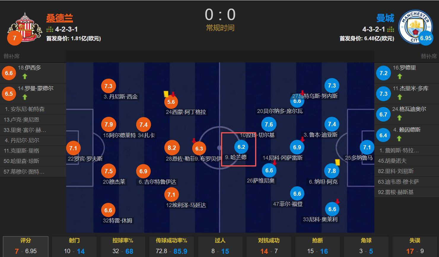 แมนเชสเตอร์ ซิตี้ 0-0 ซันเดอร์แลนด์: ฮาแลนด์ออกสตาร์ทเป็นตัวจริงและลงเล่นครบ 90 นาทีเต็มโดยไม่สามารถทำประตูได้ ได้รับคะแนนหลังจบเกมอยู่ที่ 6.2