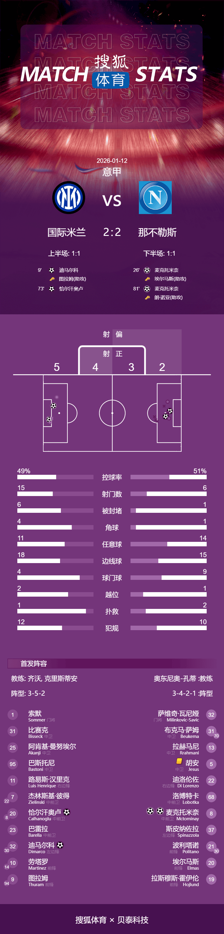 เวลา 03:45 น. ตามเวลาปักกิ่ง วันที่ 12 มกราคม 2026 อินเตอร์ มิลาน เปิดบ้านต้อนรับการมาเยือนของนาโปลี ที่สนามซาน ซิโร ในรอบที่ 20 ของเซเรีย อาในครึ่งแรก ดimarco ทำประตูให้อินเตอร์ มิลาน ขึ้นนำ ก่อนที่ McTominay จะตีเสมอให้กับนาโปลี หลังจากพักครึ่ง Çalhanoğlu ยิงจุดโทษให้อินเตอร์ขึ้นนำอีกครั้ง แต่ McTominay ก็ยิงประตูอีกครั้งเพื่อตีเสมอให้กับนาโปลี จบเกมด้วยผลเสมอ 2-2 โดยอินเตอร์ มิลาน ครองตำแหน่งจ่าฝูงของตารางลีก และนาโปลีอยู่ในอันดับที่สาม
