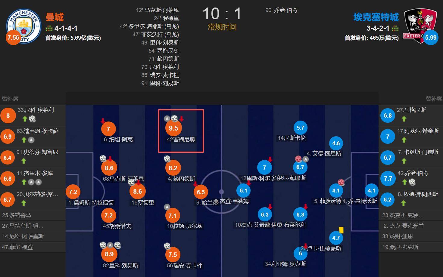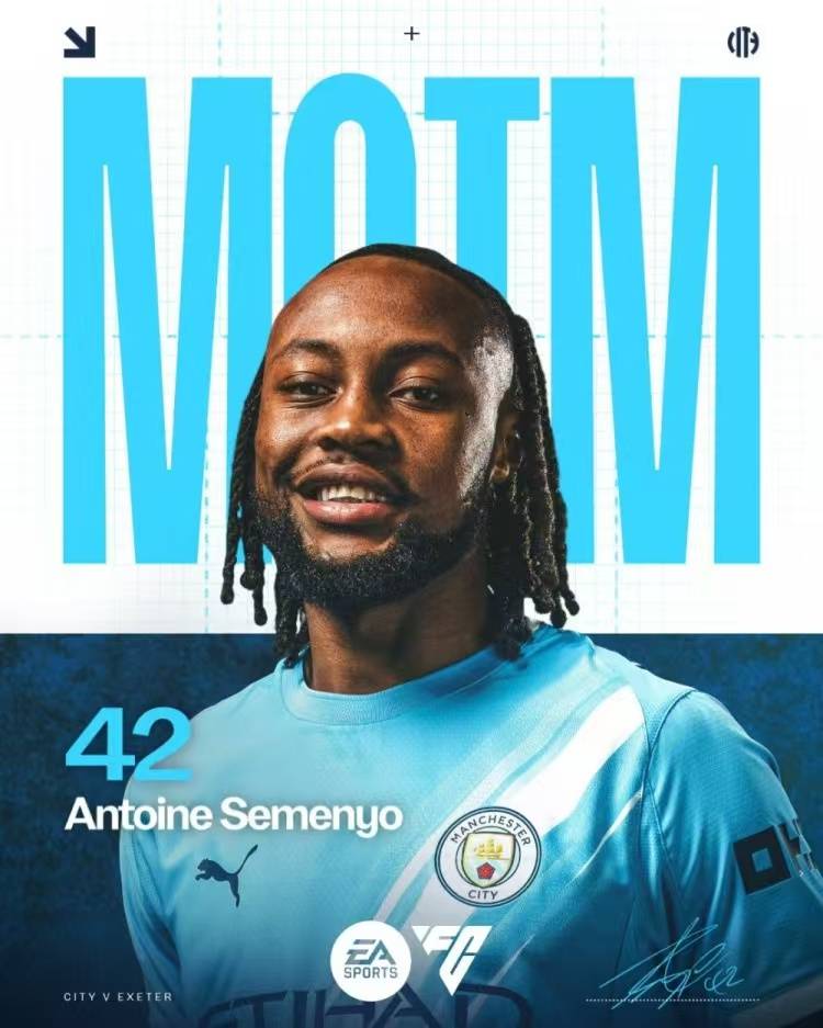 - 本周六,足总杯第3轮,曼城10-1狂胜英甲球队埃克塞特城,塞梅尼奥代表曼城首发出战,比赛第64分钟被换下,传射建功。曼城一场大胜,塞梅尼奥迎来了曼城生涯的首秀+首球+首助,赛后当选此役官方最佳球员(MVP)。此役,塞梅尼奥的数据除了传射建功之外,1次成功过人,2次关键传球,传球成功率高达92.7%。赛后,媒体给塞梅尼奥打了9.5分的全场最高分。
