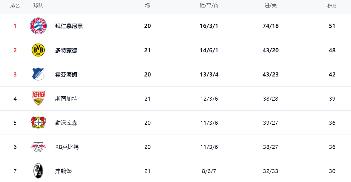 ในตารางลีก บาเยิร์น มิวนิก ยังคงครองตำแหน่งจ่าฝูงด้วยคะแนน 51 คะแนน จากการชนะ 16 นัด เสมอ 3 นัด และแพ้ 1 นัด โบรุสเซีย ดอร์ทมุนด์ ซึ่งสามารถเก็บชัยชนะติดต่อกันได้หลายนัด ได้สะสมคะแนนไปแล้ว 48 คะแนน ตามหลังบาเยิร์นเพียง 3 คะแนน อย่างไรก็ตาม ดอร์ทมุนด์ได้ลงเล่นมากกว่าบาเยิร์น 1 นัดฮอฟเฟ่นไฮม์อยู่อันดับสามด้วยคะแนน 42 คะแนน สตุ๊ตการ์ทอยู่อันดับสี่ด้วยคะแนน 39 คะแนน ไบเออร์ เลเวอร์คูเซ่นอยู่อันดับห้าด้วยคะแนน 36 คะแนน ขณะที่อาร์บี ไลป์ซิกก็มีคะแนน 36 คะแนนเช่นกัน และอยู่อันดับหก ทั้งเลเวอร์คูเซ่นและไลป์ซิกตามหลังตำแหน่งการคัดเลือกแชมเปียนส์ลีกเพียงสามคะแนนเท่านั้น ไฟร์บวร์กครองอันดับเจ็ดด้วยคะแนน 30 คะแนน