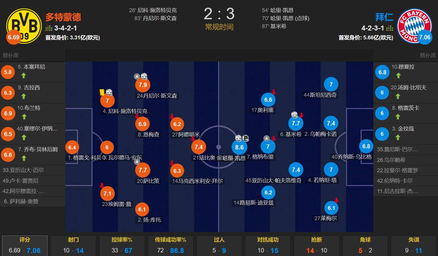 โบรุสเซีย ดอร์ทมุนด์ พบ บาเยิร์น มิวนิค: โควัชใช้แผน 3-4-2-1 โดยมี ฟาบิโอ ซิลวา เป็นกองหน้าตัวเป้า พร้อมด้วย บาเยร์ และ อาเดมี คอยสนับสนุน ยาน กูโต้, ซาบิตเซอร์, นเมชา และ สเวนส์สัน คุมแดนกลางสี่คน ขณะที่ เอ็มเร่ ชาน, แอนตอน และ ชล็อตเตอร์เบ็ค รับหน้าที่สามปราการหลัง โคเบล ลงเฝ้าเสาเป็นตัวจริง โดย 11 ตัวจริงมีมูลค่ารวม 331 ล้านยูโรค็อมปานีใช้แผนการเล่น 4-2-3-1 โดยมีเคนเป็นกองหน้าตัวเป้าเพียงคนเดียว พร้อมด้วยกนาบรีคอยสนับสนุนอยู่ด้านหลัง ดิอาซและโอลิเซ่ประจำการในตำแหน่งริมเส้น ขณะที่ปาฟโลวิชและคิมมิชจับคู่กันในแดนกลางตัวรับ กองหลังสี่คนประกอบด้วยไลเมอร์, ซูเล่, อูปาเมกาโน่ และสตานิซิช โดยมีอูลบิชเป็นผู้รักษาประตู รายชื่อผู้เล่นตัวจริงมีมูลค่ารวม 566 ล้านยูโร