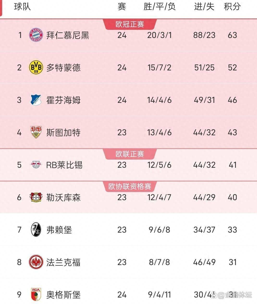 แม้จะพ่ายแพ้อย่างน่าประหลาดใจ ฮอฟเฟ่นไฮม์ยังคงรั้งอันดับสามด้วย 46 คะแนน จากการชนะ 14 นัด เสมอ 4 นัด และแพ้ 6 นัด สตุ๊ตการ์ตอยู่อันดับสี่ด้วย 43 คะแนน จากการชนะ 13 นัด เสมอ 4 นัด และแพ้ 6 นัด โดยลงเล่นน้อยกว่า 1 นัด RB ไลป์ซิก ซึ่งลงเล่นน้อยกว่า 1 นัดเช่นกัน อยู่อันดับห้าด้วย 41 คะแนน จากการชนะ 12 นัด เสมอ 5 นัด และแพ้ 6 นัด ไบเออร์ เลเวอร์คูเซ่น หลังจากเสมอกับไมนซ์ อยู่ในอันดับที่หก มี 40 คะแนน จาก 23 นัด (ชนะ 12 นัด เสมอ 4 นัด แพ้ 7 นัด) ช่องว่างคะแนนระหว่างฮอฟเฟ่นไฮม์ อันดับสาม และเลเวอร์คูเซ่น อันดับหก มีเพียง 6 คะแนนเท่านั้น