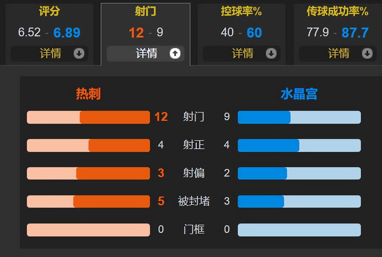 ในเกมทั้งหมด อัตราการครอบครองของท็อตแนมอยู่ที่ 40% และมีทั้งหมด 12 นัด มากกว่า 9 นัดของคริสตัล พาเลซ แต่ทั้งสองทีมอยู่ในหรือ 4 นัด และคริสตัล พาเลซยิงได้ 3 ประตู ซึ่งมีประสิทธิภาพมากกว่า