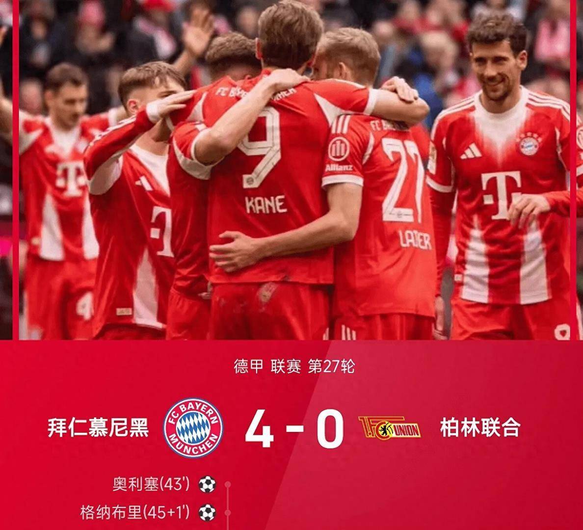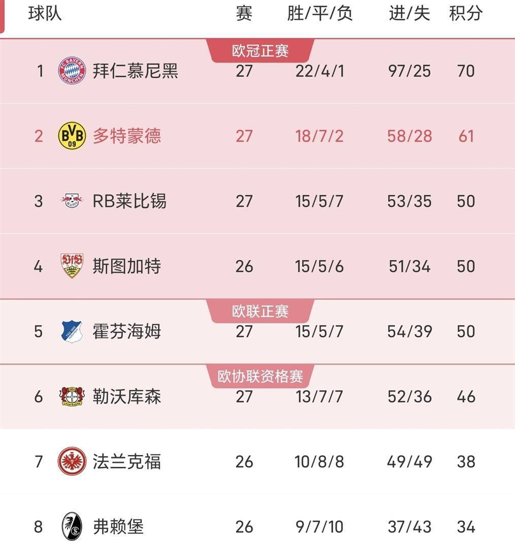 ตั้งแต่ช่วงเย็นของวันที่ 21 มีนาคม ถึงเช้าวันที่ 22 มีนาคม ตามเวลาปักกิ่ง รอบที่ 27 ของบุนเดสลีกา จบการแข่งขันแบบโฟกัสไปหลายนัด คืนนี้รูปแบบของอันดับถูกปรับโฉมใหม่ทั้งหมด บาเยิร์น มิวนิค ชนะ 4-0 ในบ้าน ขยายความเป็นผู้นำเป็น 9 แต้ม และดอร์ทมุนด์ดึงสามประตูติดต่อกันในความสิ้นหวัง 0-2 ย้อนหลัง และจัดฉาก "ปล่อยให้การไล่ล่าสามครั้ง" ที่อบอุ่นหัวใจและมุ่งโจมตีพื้นที่แชมเปี้ยนส์ลีก