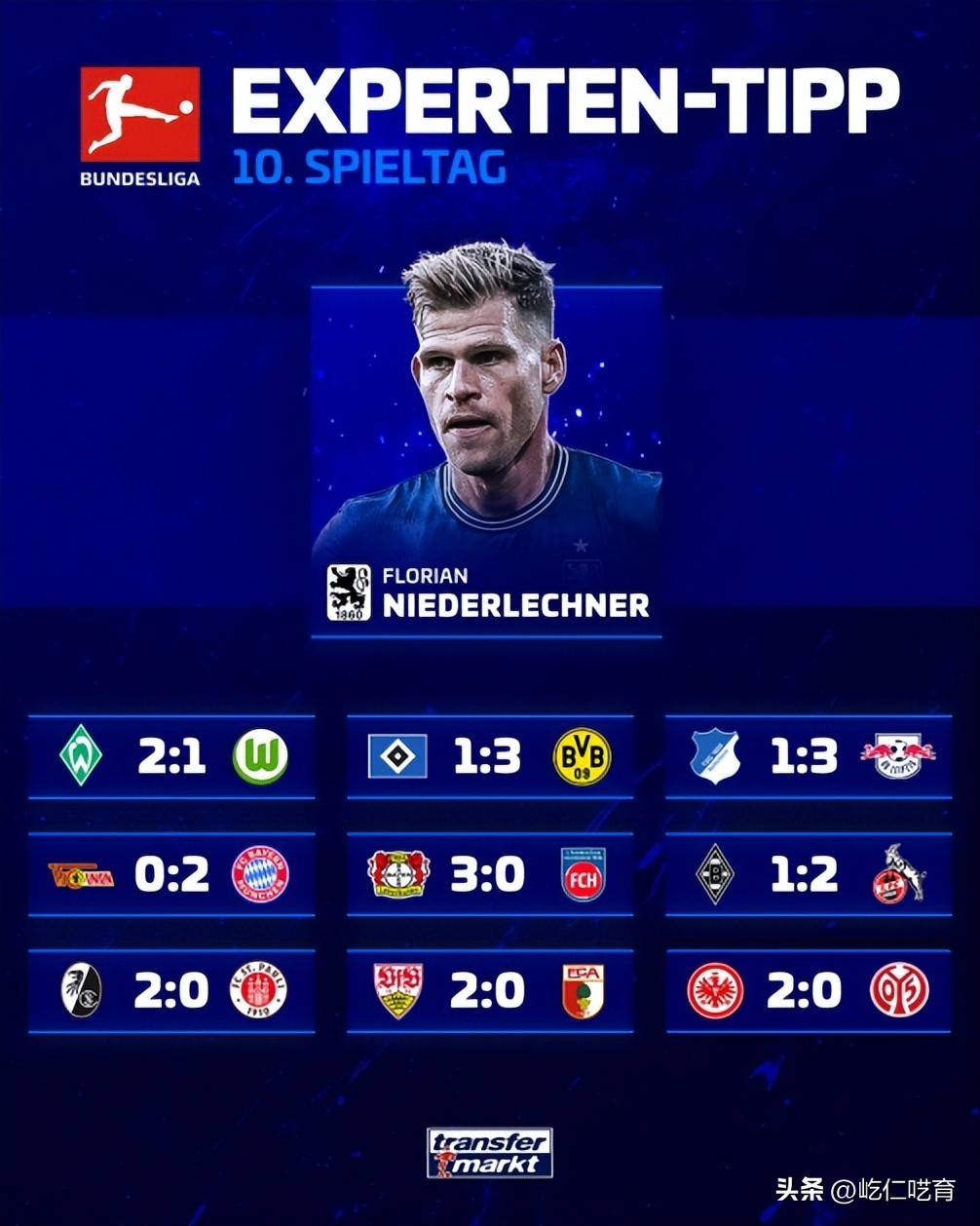 ทรานสเฟอร์มาร์ค บุนเดสลีกา ทำนายผล: เวร์เดอร์ เบรเมน 2-1 โวล์ฟสบวร์ก แฮร์ธ่า เบอร์ลิน 0-2 บาเยิร์น มิวนิค โบรุสเซีย ดอร์ทมุนด์ และ แอร์เบ ไลป์ซิก ชนะ 3-1 ทั้งคู่ ไนเดอร์เลชเนอร์ ฮอฟเฟ่นไฮม์ ไอน์ทรัค แฟรงค์