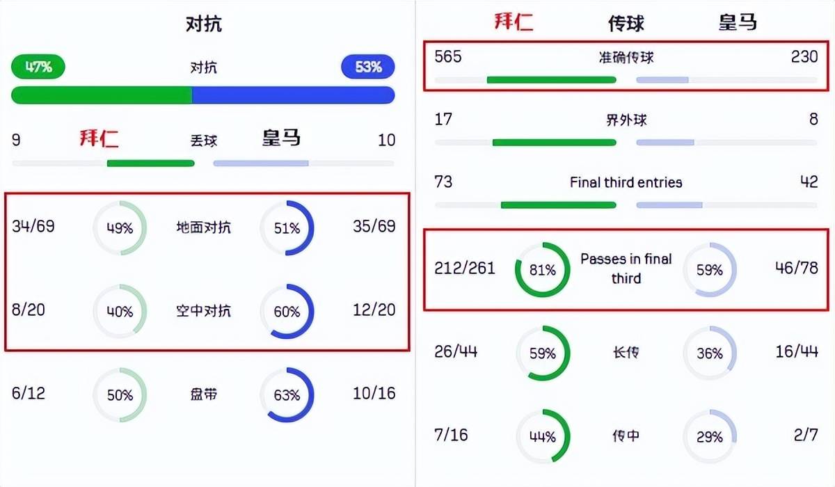 ในทางกลับกันเรอัล มาดริด ไม่ตามหลังในการเผชิญหน้าแบบตัวต่อตัว ซึ่งทำให้ทีมของกอมปานีไม่สบายใจมาก แต่โชคดีที่ร่างกายของทีมเยอรมันยังดีกว่าแม้ว่าบางรอบปกติจะแบ่งเท่าๆ กัน แต่ในผลกระทบต่อหน้าประตู บาเยิร์น ครองตำแหน่งมากกว่า