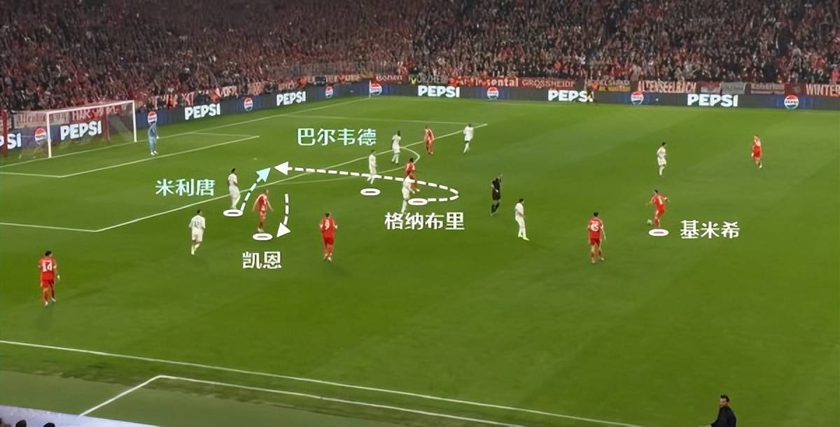 การใช้ Kane ดึงกลับ เขาให้กองหลังตัวจริงของ Real Madrid ไปที่เข็มขัด กองหน้าของ Gnabury หรือ Diaz ซึ่งกลายเป็นการเคลื่อนไหวของนักฆ่าของบาเยิร์น