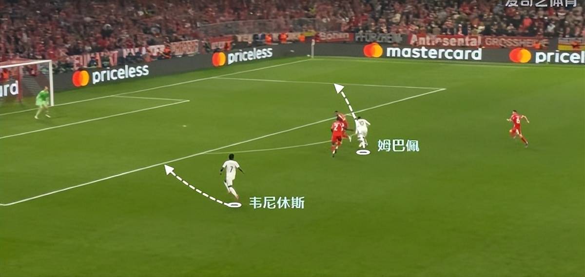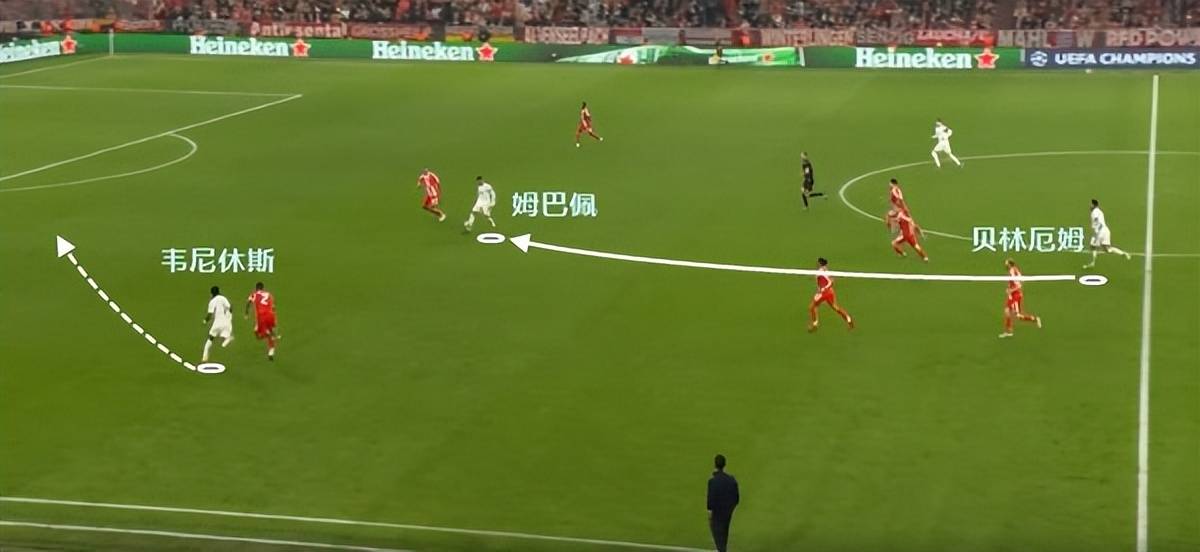 การเริ่มต้นอย่างรวดเร็วของ Mbappe ในการโต้กลับก็เหมือนเสือชีตาห์ คราวนี้ยังคงเป็นเบลลิงแฮมที่เอาบอลไปหาเวฮิวจ์สนำโอกาสที่จะนำด้านข้าง เดิมที Mbappe วิ่งด้วยความเร็วที่ค่อนข้างสม่ำเสมอ แต่เมื่อเขาเห็นว่า Wenghes มีโอกาสผ่านบอล เขาก็เพิ่มความเร็วขึ้นในทันใด