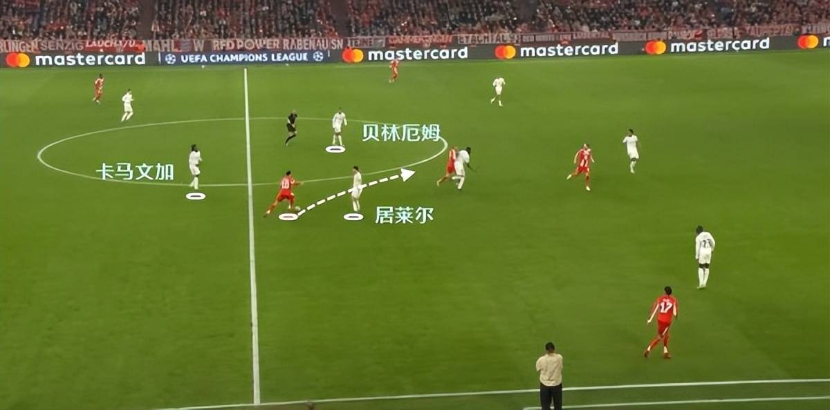 ทักษะของเบลลิงแฮมไม่ได้ดีนัก แต่เขามีความแข็งแกร่งและการเผชิญหน้าทางกายภาพ และในขณะเดียวกันก็สามารถนำลูกบอลไปสู่ความเร็วได้ การป้องกันของบาเยิร์นขาดความรู้สึกของลำดับชั้น และขึ้นอยู่กับการระเบิดแบบจุดต่อจุดเป็นอย่างมาก เป็นผลให้แม้ว่าเบลลิงแฮมจะกลิ้งและคลาน แต่เขาสามารถทำตัวต่อตัวได้ซึ่งนำไปสู่ปัญหามากมายในฝั่งของบาเยิร์น